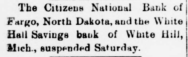 The Citizens National Bank of Fargo, North Dakota, and the White Hall Savings bank of White Hill, Mich., suspended Saturday.
