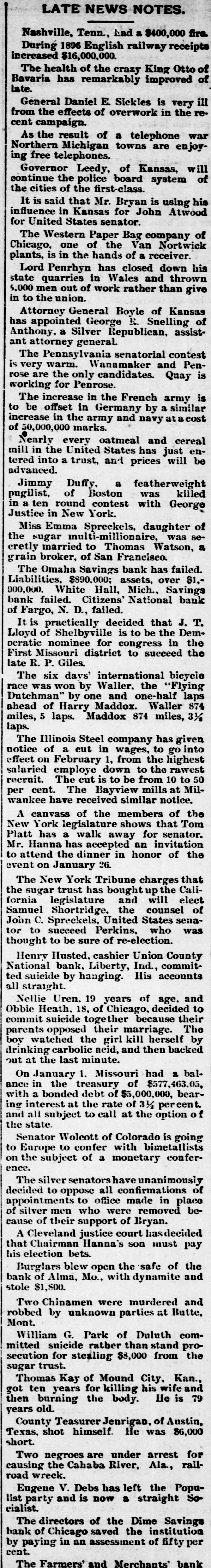 LATE NEWS NOTES. Nashville, Tenn., had a $400,000 fire. During 1896 English railway receipts increased $16,000,000. The health of the crazy King Otto of Bavaria has remarkably improved of late. General Daniel E. Sickles is very ill from the effects of overwork in the recent campaign. As the result of a telephone war Northern Michigan towns are enjoying free telephones. Governor Leedy, of Kansas, will continue the police board system of the cities of the first-class. It is said that Mr. Bryan is using his influence in Kansas for John Atwood for United States senator. The Western Paper Bag company of Chicago. one of the Van Nortwick plants, is in the hands of a receiver. Lord Penrhyn has closed down his state quarries in Wales and thrown 5,000 men out of work rather than give in to the union. Attorney General Boyle of Kansas has appointed George R. Snelling of Anthony. a Silver Republican, assistant attorney general. The Pennsylvania senatorial contest is very warm. Wanamaker and Penrose are the only candidates. Quay is working for Penrose. The increase in the French army is to be offset in Germany by a similar increase in the army and navy atacost of 50,000,000 marks. Nearly every oatmeal and cereal mill in the United States has just entered into a trust, and prices will be advanced. Jimmy Duffy, a featherweight pugilist, of Boston was killed in a ten round contest with George Justice in New York. Miss Emma Spreckels, daughter of the sugar multi-millionaire, was secretly married to Thomas Watson, a grain broker, of San Francisco. The Omaha Savings bank has failed. Liabilities, $890,000; assets, over $1,000,000. White Hall, Mich., Savings bank failed. Citizens' National bank of Fargo, N. D., failed. It is practically decided that J. T. Lloyd of Shelbyville is to be the Democratic nominee for congress in the First Missouri district to succeed the late R. P. Giles. The six davs' international bicycle race was won by Waller, the "Flying Dutchman" by one and one-half laps ahead of Harry Maddox. Waller 874 miles, 5 laps. Maddox 874 miles, 3½ laps. The Illinois Steel company has given notice of a cut in wages, to go into effect on February 1, from the highest salaried employe down to the rawest recruit. The cut is to be from 10 to 50 per cent. The Bayview mills at Milwankee have received similar notice. A canvass of the members of the New York legislature shows that Tom Platt has a walk away for senator. Mr. Hanna has accepted an invitation to attend the dinner in honor of the event on January 26. The New York Tribune charges that the sugar trust has bought up the California legislature and will elect Samuel Shortridge, the counsel of John C. Spreckels, United States senator to succeed Perkins, who was thought to be sure of re-election. Henry Husted, cashier Union County National bank, Liberty, Ind., committed suicide by hanging. Ilis accounts all straight. Nellie Uren. 19 years of age, and Obbie Heath. 18, of Chicago, decided to commit suicide together because their parents opposed their marriage. The boy watched the girl kill herself by drinking carbolic acid, and then backed out at the last minute. On January 1. Missouri had a balance in the treasury of $577,463.05, with a bonded debt of $5,000,000, bearing interest at the rate of 3½ per cent. and all subject to call at the option of the state. Senator Wolcott of Colorado is going to Europe to confer with bimetallists on the subject of a monetary conference. The silver senators have unanimously decided to oppose all confirmations of appointments to office made in place of silver men who were removed because of their support of Bryan. A Cleveland justice court hasdecided that Chairman Hanna's son must pay his election bets. Burglars blew open the safe of the bank of Alma, Mo., with dynamite and stole $1,S00. Two Chinamen were murdered and robbed by unknown parties at Butte, Mont. William G. Park of Duluth committed suicide rather than stand prosecution for stealing $8,000 from the sugar trust. Thomas Kay of Mound City, Kan., got ten years for killing his wife and then burning the body. He is 79 years old. County Teasurer Jenrigan, of Austin, Texas, shot himself. He was $6,000 short. Two negroes are under arrest for causing the Cahaba River, Ala, railroad wreck. Eugene V. Debs has left the Populist party and is now a straight Socialist. The directors of the Dime Savings bank of Chicago saved the institution by paying in an assessment of fifty per cent. The Farmers' and Merchants' bank
