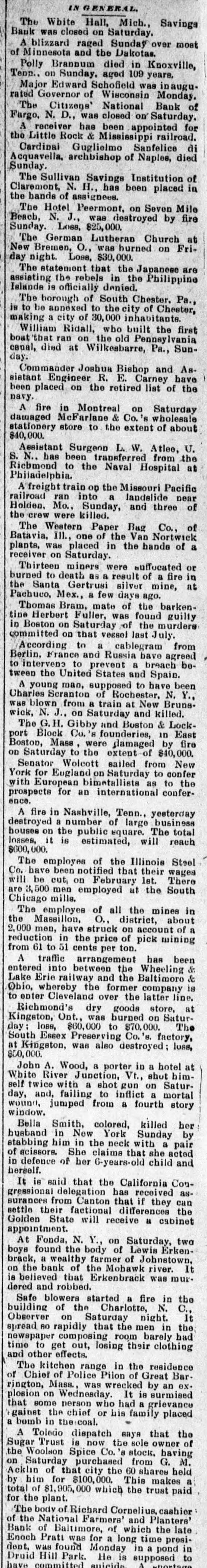 INTERNATION The White Hall, Mich., Savings Bank was closed on Saturday. A blizzard raged Sunday over most of Minnesota and the Dakotas. Polly Brannum died in Knoxville, Tenn.. on Sunday. aged 109 years. Major Edward Schofield was inaugurated Governor of Wisconsin Monday. The Citizens' National Bank of Fargo, N. D., was closed on Saturday. A receiver has been appointed for the Little Rock & Mississippi railroad. Cardinal Guglielmo Sanfelice di Acquavella, archbishop of Naples, died Sunday. The Sullivan Savings Institution of Claremont, N. H., has been placed in the hands of assigness. The Hotel Peermont, on Seven Mile Beach, N. J., was destroyed by fire Sunday. Loss, $25,000. The German Lutheran Church at New Bremen, O., was hurned on Friday night. Loss, $30,000. The statement that the Japanese are assisting the rebels in the Philippine Islands is officially denied. The borough of South Chester. Pa., is to be annexed to the city of Chester, making a city of 30,000 inhabitants. William Ridall, who built the first boat that ran on the old Pennsylvania canal, died at Wilkesbarre, Pa., Sunday. Commander Joshua Bishop and Assistant Engineer R. E. Carney have been placed on the retired list of the "RABU A fire in Montreal on Saturday damaged McFarlane & Co. 's wholesale stationery store to the extent of about Assistant Surgeon L. W. Atlee, U. S. N.. has been transferred from the Richmond to the Naval Hospital at Philadelphia. freight train on the Missouri Pacific railroad ran into a landslide near Holden. Mo., Sunday, and three of the crew were killed. The Western Paper Bag Co., of Northick "A" eqf jo euo "III Bataria, B 10 вравq eqf a! person REM Plants, receiver on Saturday. Thirteen miners were suffucated or ur ere B JO there B SB death 01 pearnq the Santa Gertrusi silver mine, at Pachuco, Mex., a few days ago. Thomas Bram, mate of the barkentine Herbert Fuller, was found guilty in Boston on Saturday of the murders committed on that vessel last July. According to a cablegram from Berlin. France and Russia have agreed to intervens to prevent a breach between the United States and Spain. A young man, supposed to have been Charles Scranton of Rochester. N. Y., was blown from a train at New Brunswick, N. J., on Saturday and killed. The H. Gibby and Boston & Lockport Block Co. s founderies, in East Boston, Mass were damaged by fire '000'0F$ Jo queixo eq: 01 Surriday do Senator Wolcott sailed from New York for Eugland on Saturday to confer with European bimetallists as to the prospects for an international conference. A fire in Nashville, Tenn., yesterday destroyed a number of large business houses on the public square. The total Insses, it is estimated, will reach 000'000$ The employes of the Illinois Steel Co. have been notified that their wages will be cut, on February let. There are 3,500 men employed at the South Chicago mills. The employes of all the mines in the Massillon, O., district, about B JO account no struch have 'new 000's reduction in the price of pick mining from 61 to 51 cents per ton. A traffic arrangement has been entered into between the Wheeling & Lake Erie railway and the Baltimore & Ohio, whereby the former company is to enter Cleveland over the latter line. Richmond's dry goods store, at Kingston, Ont., was burned on Saturday; loss, $60,000 to $70.000. The South Essex Preserving Co. factory, at Kingston, was also destroyed; loss, 000'00$ John A. Wood, a porter in a hotel at White River Junction, Vt., shut himSature- uo una tous B 9114 twice IIes day, and, failing to inflict a mortal wound, jumped from a fourth story window. Bella Smith, colored, killed her husband in New York Sunday by stabbing him in the neck with a pair of scissors. She claims that she acted in defence of her 6-years-old child and berrelf It is said that the California Congressional delegation has received assurances from Canton that if they can settle their factional differences the Golden State will receive a cabinet At Fonda, N. Y., on Saturday, two boys found the body of Lewis Erkenbrack, a wealthy farmer of Johnstown. on the bank of the Mobawk river. It is believed that Erkenbrack was murdered and robbed. Safe blowers started a fire in the "O N Charlotte eqs 10 Purpling Observer on Saturday night. It spread 80 rapidly that the men in the newspaper composing room barely had time to get out, losing their clothing