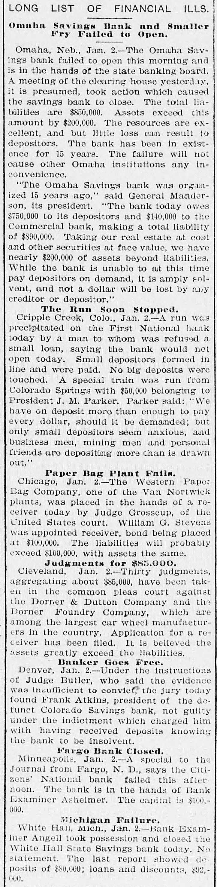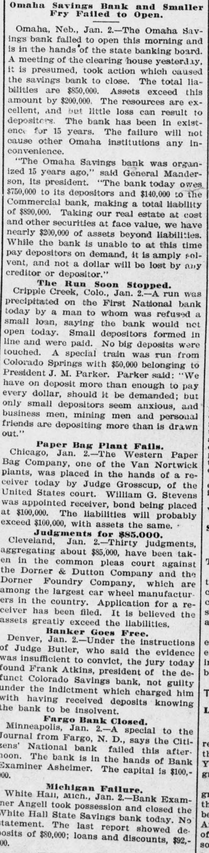 LONG LIST OF FINANCIAL ILLS. Omaha Savings Bank and Smaller Fry Failed to Open. Omaha, Neb., Jan. 2.-The Omaha Savings bank failed to open this morning and is in the hands of the state banking board. A meeting of the clearing house yesterday, it is presumed, took action which caused the savings bank to close. The total liabilities are $850,000. Assets exceed this amount by $200,000. The resources are excellent, and but little loss can result to depositors. The bank has been in existence for 15 years. The failure will not cause other Omaha institutions any inconvenience. "The Omaha Savings bank was organized 15 years ago," said General Manderson, its president. "The bank today owes $750,000 to its depositors and $140,000 to the Commercial bank, making a total liability of $890,000. Taking our real estate at cost and other securities at face value, we have nearly $200,000 of assets beyond liabilities. While the bank is unable to ait this time pay depositors on demand, it is amply solvent, and not a dollar will be lost by any creditor or depositor." The Run Soon Stopped. Cripple Creek, Colo., Jan. 2.-A run was precipitated on the First National bank today by a man to whom was refused a small loan, saying the bank would not open today. Small depositors formed in line and were paid. No big deposits were touched. A special train was run from Colorado Springs with $50,000 belonging to President J. M. Parker. Parker said: "We have on deposit more than enough to pay every dollar, should it be demanded; but only small depositors seem anxious, and business men, mining men and personal friends are depositing more than is drawn out." Paper Bag Plant Fails. Chicago, Jan. 2.-The Western Paper Bag Company, one of the Van Nortwick plants, was placed in the hands of a receiver today by Judge Grosscup, of the United States court. William G. Stevens was appointed receiver, bond being placed at $100,000. The liabilities will probably exceed $100,000, with assets the same. Judgments for $85.000. Cleveland, Jan. 2.-Thirty judgments, aggregating about $85,000, have been taken in the common pleas court against the Dorner & Dutton Company and the Dorner Foundry Company, which are among the largest car wheel manufacturers in the country. Application for a receiver has been filed. It is believed the assets greatly exceed the liabilities. Banker Goes Free. Denver, Jan. 2.-Under the instructions of Judge Butler, who said the evidence was insufficient to convict, the jury today found Frank Atkins, president of the defunct Colorado Savings bank, not guilty under the indictment which charged him with having received deposits knowing the bank to be insolvent. Fargo Bank Closed. Minneapolis, Jan. 2.-A special to the Journal from Fargo, N. D., says the Citizens' National bank failed this afternoon. The bank is in the hands of Bank Examiner Asheimer. The capital is $100,000. Michigan Failure. White Han, Mich., Jan. 2.-Bank Examiner Angell took possession and closed the White Hall State Savings bank today. No statement. The last report showed deposits of $80,000; loans and discounts, $92,000.