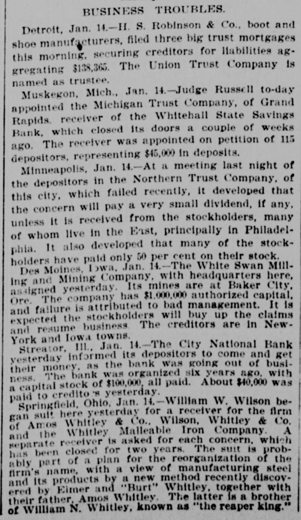 BUSINESS TROUBLES. Detroit, Jan. 14.-H. S. Robinson & Co., boot and shoe manufacturers, filed three big trust mortgages this morning, securing creditors for liabilities aggregating $138,365. The Union Trust Company is named as trustee. Muskegon, Mich., Jan. 14.-Judge Russell to-day appointed the Michigan Trust Company, of Grand Rapids. receiver of the Whitehall State Savings Bank, which closed its doors a couple of weeks ago. The receiver was appointed on petition of 115 depositors, representing $45,000 in deposits. Minneapolis, Jan. 14.-At a meeting last night of the depositors in the Northern Trust Company, of this city, which failed recently, it developed that the concern will pay a very small dividend, if any, unless it is received from the stockholders, many of whom live in the East, principally in Philadelphia. It also developed that many of the stockholders have paid only 50 per cent on their stock. Des Moines, Iowa, Jan. 14.-The White Swan Milling and Mining Company, with headquarters here, assigned yesterday. Its mines are at Baker City, Ore. The company has $1,000,000 authorized capital, and failure is attributed to bad management. It is expected the stockholders will buy up the claims and resume business. The creditors are in NewYork and Iowa towns. Streator, III., Jan. 14.-The City National Bank yesterday informed its depositors to come and get their money, as the bank was going out of business. The bank was organized six years ago, with a capital stock of $100,000, all paid. About $40,000 was paid to credito 'S yesterday. Springfield, Ohio, Jan. 14.-Willam W. Wilson began sult here yesterday for a receiver for the firm of Amos Whitley & Co., Wilson, Whitley & Co. and the Whitley Malleable Iron Company. A separate receiver is asked for each concern, which has been closed for two years. The suit is probably part of a plan for the reorganization of the firm's name, with a view of manufacturing steel and Its products by a new method recently discovered by Eimer and "Burt" Whitley, together with their father, Amos Whitley. The latter is a brother of William N. Whitley, known as "the reaper king."
