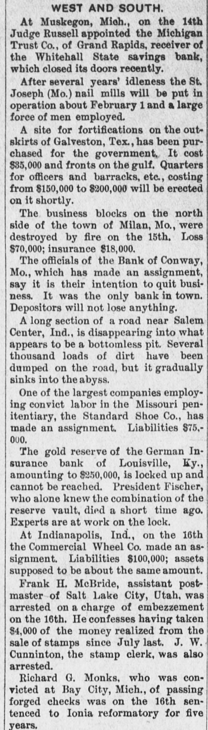 WEST AND SOUTH. At Muskegon, Mich., on the 14th Judge Russell appointed the Michigan Trust Co., of Grand Rapids, receiver of the Whitehall State savings bank, which closed its doors recently. After several years' idleness the St. Joseph (Mo.) nail mills will be put in operation about February 1 and a large force of men employed. A site for fortifications on the outskirts of Galveston, Tex., has been purchased for the government, It cost $35,000 and fronts on the gulf. Quarters for officers and barracks, etc., costing from $150,000 to $200,000 will be erected on it shortly. The business blocks on the north side of the town of Milan, Mo., were destroyed by fire on the 15th. Loss $70,000; insurance $18,000. The officials of the Bank of Conway, Mo., which has made an assignment, say it is their intention to quit business. It was the only bank in town. Depositors will not lose anything. A long section of a road near Salem Center, Ind., is disappearing into what appears to be a bottomless pit. Several thousand loads of dirt have been dumped on the road, but it gradually sinks into the abyss. One of the largest companies employing convict labor in the Missouri penitentiary, the Standard Shoe Co., has made an assignment. Liabilities $75,000. The gold reserve of the German Insurance bank of Louisville, Ky., amounting to $250,000, is locked up and cannot be reached. President Fischer, who alone knew the combination of the reserve vault, died a short time ago. Experts are at work on the lock. At Indianapolis, Ind., on the 16th the Commercial Wheel Co. made an assignment. Liabilities $100,000; assets supposed to be about the same amount. Frank H. McBride, assistant postmaster of Salt Lake City, Utah, was arrested on a charge of embezzement on the 16th. He confesses having taken $4,000 of the money realized from the sale of stamps since July last. J. W. Cunninton, the stamp clerk, was also arrested. Richard G. Monks, who was convicted at Bay City, Mich., of passing forged checks was on the 16th sentenced to Ionia reformatory for five years.
