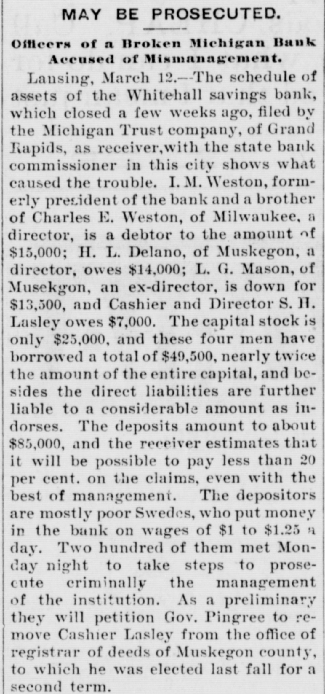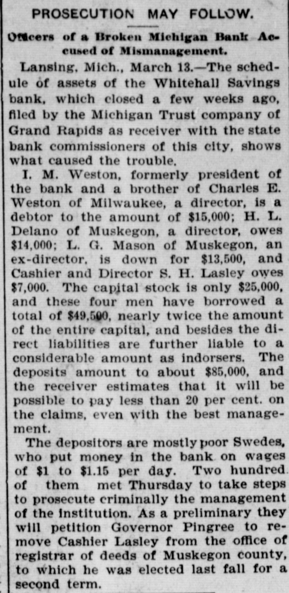 PROSECUTION MAY FOLLOW. Officers of a Broken Michigan Bank Accused of Mismanagement. Lansing, Mich., March 13.-The schedule of assets of the Whitehall Savings bank, which closed a few weeks ago, filed by the Michigan Trust company of Grand Rapids as receiver with the state bank commissioners of this city, shows what caused the trouble. I. M. Weston, formerly president of the bank and a brother of Charles E. Weston of Milwaukee, a director, is a debtor to the amount of $15,000; H. L. Delano of Muskegon, a director, owes $14,000; L. G. Mason of Muskegon, an ex-director, is down for $13,500, and Cashier and Director S. H. Lasley owes $7,000. The capital stock is only $25,000, and these four men have borrowed a total of $49,500, nearly twice the amount of the entire capital, and besides the direct liabilities are further liable to a considerable amount as indorsers. The deposits amount to about $85,000, and the receiver estimates that it will be possible to pay less than 20 per cent. on the claims, even with the best management. The depositors are mostly poor Swedes, who put money in the bank on wages of $1 to $1.15 per day. Two hundred of them met Thursday to take steps to prosecute criminally the management of the institution. As a preliminary they will petition Governor Pingree to remove Cashier Lasley from the office of registrar of deeds of Muskegon county, to which he was elected last fall for a second term.