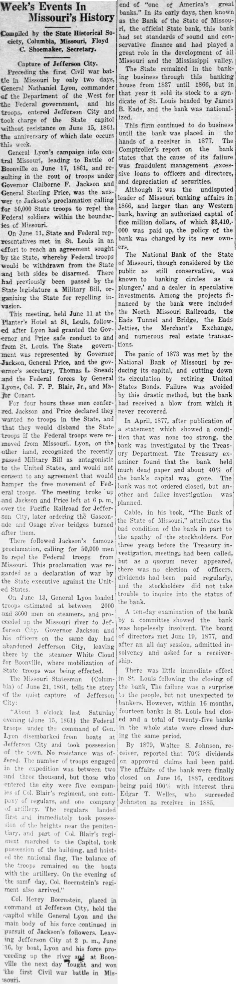 Week's Events In Missouri's History Compiled by the State Historical Society, Columbia, Missouri, Floyd C. Shoemaker, Secretary. Capture of Jefferson City. Preceding the first Civil war battle in Missouri by only two days, General Nathaniel Lyon, commander of the Department of the West for the Federal government, and his troops, entered Jefferson City and took charge of the State capitol without resistance on June 15, 1861, the anniversary of which date occurs this week. General Lyon's campaign into central Missouri, leading to Battle of Boonville on June 17, 1861, and resulting in the rout of troops under Governor Claiborne F. Jackson and General Sterling Price, was the answer to Jackson's proclamation calling for 50,000 State troops to repel the Federal soldiers within the boundaries of Missouri. On June 11, State and Federal representatives met in St. Louis in an effort to reach an agreement sought by the State, whereby Federal troops would be withdrawn from the State and both sides be disarmed. There had previously been passed by the State legislature a Military Bill, organizing the State for repelling invasion. This meeting, held June 11 at the Planter's Hotel at St. Louis, followed after Lyon had granted the Governor and Price safe conduct to and from St. Louis. The State government was represented by Governor Jackson, General Price, and the governor's secretary, Thomas L. Snead; and the Federal forces by General Lyons, Col. F. P. Blair, Jr., and MaFor four hours these men conferred. Jackson and Price declared they wanted no troops in the State, and that they would disband the State troops if the Federal troops were removed from Missouri.. Lyon, on the other hand, recognized the recently passed Military Bill as antagonistic to the United States, and would not consent to any agreement that would hamper the free movement of Federal troops. The meeting broke up and Jackson and Price left at m. over the Pacific Railroad for Jefferson City, later ordering the Gasconade and Osage river bridges burned after them. There followed Jackson's famous proclamation, calling for 50,000 men to repel the Federal troops from Missouri. This proclamation was regarded as declaration of war by the State executive against the United States. On June 13, General Lyon loaded troops estimated at between 2000 and 3000 men on steamers, and proceeded up the Missouri river to Jefferson City. Governor Jackson and his officers on the same day had abandoned Jefferson City, leaving there by the steamer White Cloud for Boonville, where mobilization of State troops was being effected. The Missouri Statesman (Columbia) of June 21, 1861, tells the story of the quiet capture of Jefferson City: "About 3 o'clock last Saturday evening (June 15, 1861) the Federal troops under the command of Gen. Lyon disembarked from boats at Jefferson City and took possession of the town. No resistance was offered. The number of troops engaged in the expedition was between two and three thousand, but those who entered the city were five companles of Col. Blair's regiment, one company of regulars, and one company of artillery. The regulars landed first and immediately took possession of the heights near the penitentiary, and part of Col. Blair's regiment marched to the Capitol, took possession of the building, and hoisted the national flag. The balance of the troops remained on the boats with the artillery. On the evening of the same day, Col. Boernstein's regiment also arrived." Col. Henry Boernstein, placed in command at Jefferson City, held the capitol while General Lyon and the main body of his force continued in pursuit of Jackson's followers. Leaving Jefferson City at 2 p. m., June 16, by boat, Lyon and his force proceeding up the river at Boonville the next day fought and won the first Civil war battle in Missouri. end of "one of America's great banks." In its early days, then known as the Bank of the State of Missouri, the official State bank, this bank had set standards of sound and conservative finance and had played great role in the development of all Missouri and the Mississippi valley. The State remained in the banking business through this banking house from 1837 until 1866, but in that year it sold its stock to a syndicate of St. Louis headed by James B. Eads, and the bank was nationalized. This firm continued to do business until the bank was placed in the hands of a receiver in 1877. The Comptroller's report on the bank states that the cause of its failure was fraudulent management ,excessive loans to officers and directors, and depreciation of securities. Although it was the undisputed leader of Missouri banking affairs in 1866, and larger than any Western bank, having an authorized captal of fice million dollars, of which $3,410,000 was paid up, the policy of the bank was changed by its new own- The National Bank of the State of Missouri, though considered by the public as still conservative, was known to banking circles as plunger,' and a dealer in speculative investments. Among the projects financed by the bank were included the North Missouri Railroads, the Eads Tunnel and Bridge, the Eads Jetties, the Merchant's Exchange, and numerous real estate transactions. The panic of 1873 was met by the National Bank of Missouri by reducing its capital, and cutting down its circulation by retiring United States Bonds. Failure was avoided by this drastic method, but the bank had received a blow from which it never recovered. In April, 1877, after publication of statement which showed a condition that was none too strong, the bank was investigated by the Treasury Department. The Treasury examiner found that the bank held much dead paper and about 40% of the bank's capital was gone. The bank was not ordered closed, but another and fuller investigation was planned. Cable, in his book, "The Bank of the State of Missouri," attributes the bad condition of the bank in part to the apathy of the stockholders. For three years before the Tre