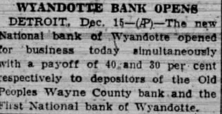 WYANDOTTE BANK OPENS DETROIT, Dec. 15-(P)-The new National bank of Wyandotte opened for business today simultaneously with a payoff of 40 and 30 per cent respectively to depositors of the Old Peoples Wayne County bank and the First National bank of Wyandotte.