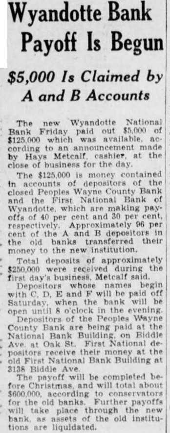 The new Wyandotte National Bank Friday $5,000 of $125,000 which was available, according to an made by Hays Metcalf at the close business for the day. The $125,000 money contained in accounts of depositors of the closed Peoples Wayne County Bank and First National Bank of offs of and 30 cent, per 96 per the B the old transferred their money the new institution. Total deposits of approximately $250,000 during the day's business. Metcalf whose names begin with D. and will be paid off Saturday. when the bank will be open until the evening. Depositors of the Wayne County Bank are being paid the National Bank Building on Biddle Ave Oak First depositors receive at the old First National Bank Building 3138 Biddle The payoff will be completed before Christmas, and will total about $600,000. according for the old Further payoffs take place through assets of old institutions are liquidated.