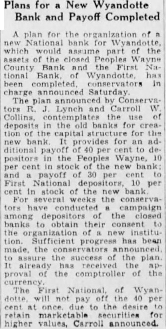 Plans for New Wyandotte Bank and Payoff Completed plan for the organization of National bank for which would assume part of the assets the closed County Bank and tional Bank Wyandotte has conservators charge announced Saturday announced by Conserva Lynch and Carroll Collins, the deposits the banks for crea. tion the capital structure for the bank provides for ditional payoff cent positors the Peoples in and payoff First National depositors, 10 per cent in stock of the bank For several weeks the conserva tors have conducted campaign among depositors of the closed banks to obtain consent the tion Sufficient has been made, the assure the success the plan. already proval the comptroller of the currency The First National, of Wyanto the retain marketable for higher values, Carroll announced.