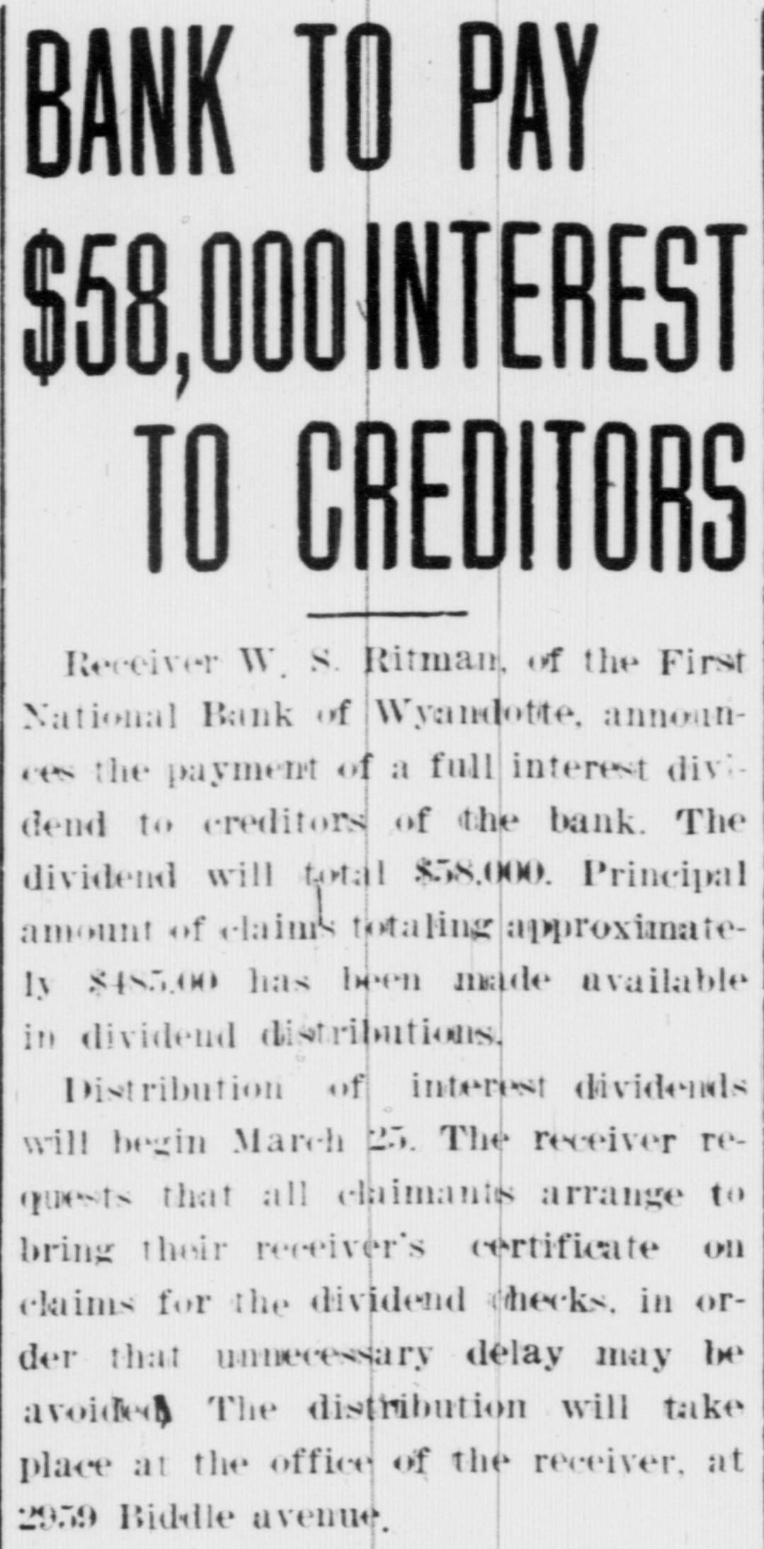 BANK TO PAY $58, ,000INTEREST TO CREDITORS Receiver W. S. Ritman, of the First National Bank of Wyandotte, announces the payment of a full interest dividend to creditors of the bank. The dividend will total $58,000. Principal amount of claims totaling approximately $485.00 has been made available in dividend distributions. Distribution of interest dividends will begin March 25. The receiver requests that all chimants arrange to bring their receiver's certificate on claims for the dividend checks. in order that unnecessary delay may be avoided The distribution will take place at the office of the receiver, at 2959 Biddle avenue.