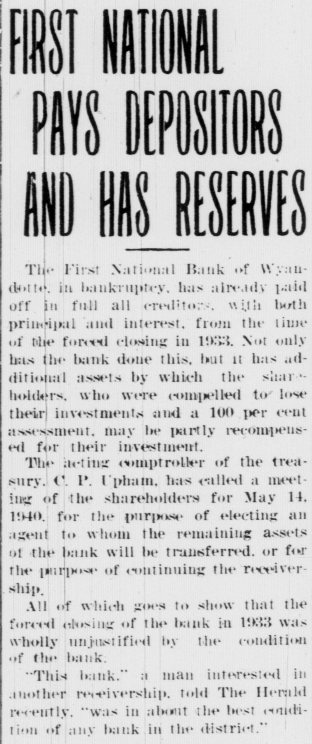 FIRST NATIONAL PAYS DEPOSITORS AND HAS RESERVES The First National Bank of Wyandotte. in bankruptey. has already paid off in full all creditors. with both principal and interest. from the time of the forced closing in 1933. Not only has the bank done this, but it has additional assets by which the shareholders. who were compelled to lose their investments and a 100 per cent assessment. may be partly recompensed for their investment. The acting comptroller of the treasury. C. P. Upham, has called a meeting of the shareholders for May 14. 1940. for the purpose of electing an agent to whom the remaining assets of the bank will be transferred. or for the purpose of continuing the receivership. All of which goes to show that the forced closing of the bank in 1933 was wholly unjustified by the condition of the bank. "This bank." a man interested in another receivership. told The Herald recently. "was in about the best condition of any bank in the district."