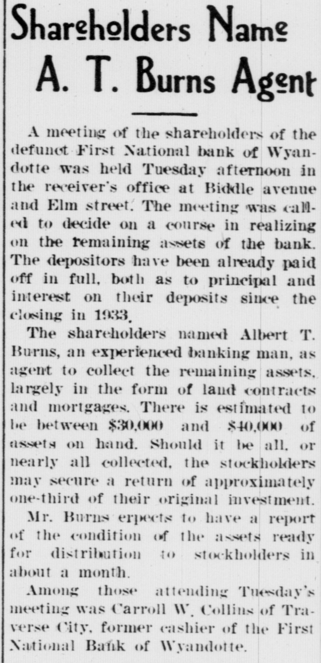 Shareholders Name A. T. Burns Agent A meeting of the shareholders of the defunct First National bank of Wyandotte was held Tuesday afternoon in the receiver's office at Biddle avenue and Elm street. The meeting was called to decide on a course in realizing on the remaining assets of the bank. The depositors have been already paid off in full, both as to principal and interest on their deposits since the closing in 1933. The shareholders named Albert T. Burns, an experienced banking man, as agent to collect the remaining assets, largely in the form of land contracts and mortgages. There is estimated to be between $30,000 and $40,000 of assets on hand. Should it be all. or nearly all collected. the stockholders may secure a return of approximately one-third of their original investment. Mr. Burns erpects to have a report of the condition of the assets ready for distribution to stockholders in about a month. Among those attending Tuesday's meeting was Carroll W. Collins of Traverse City, former cashier of the First National Bank of Wyandotte.
