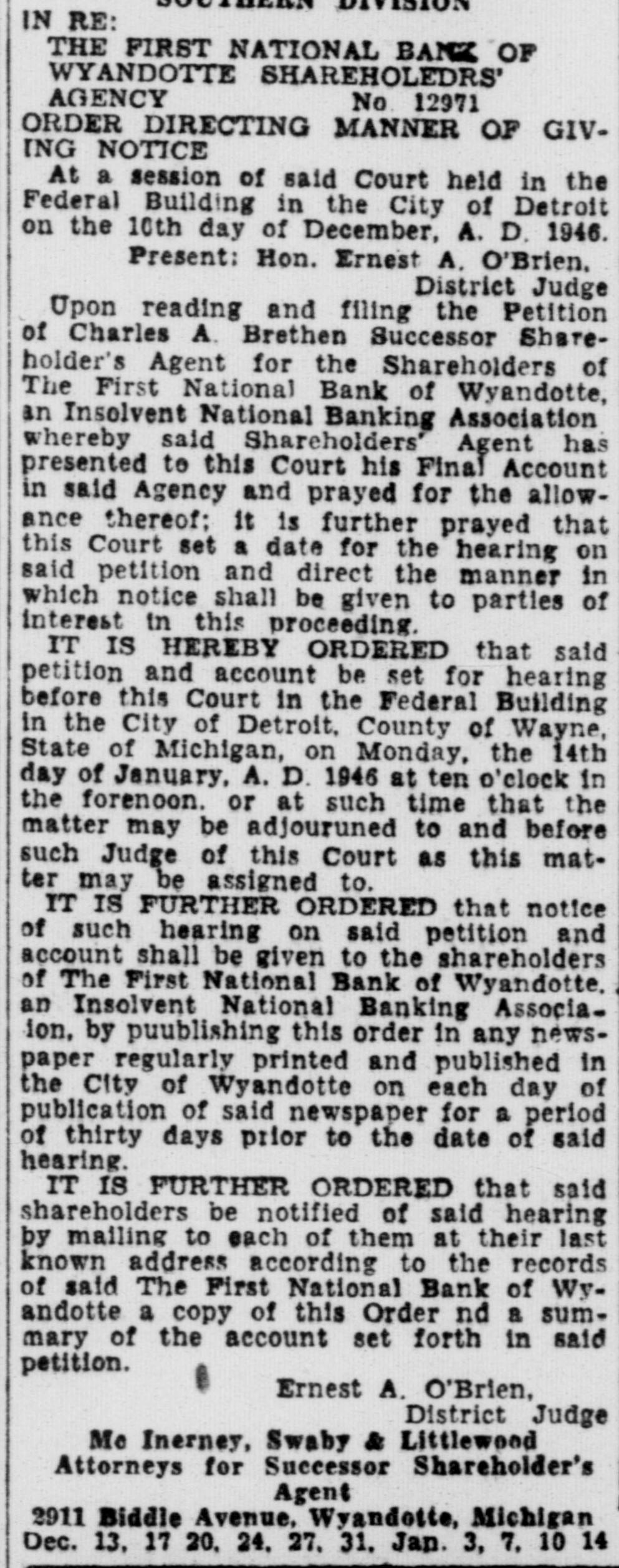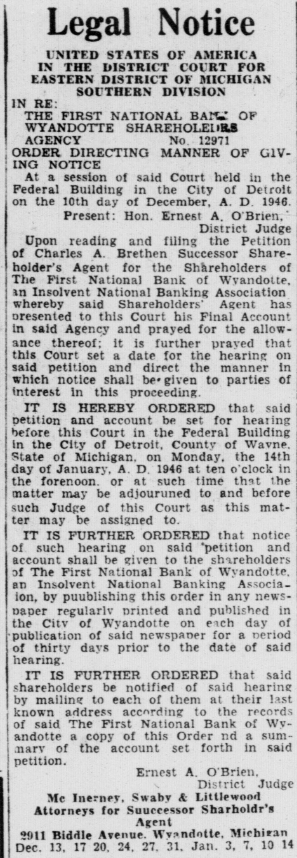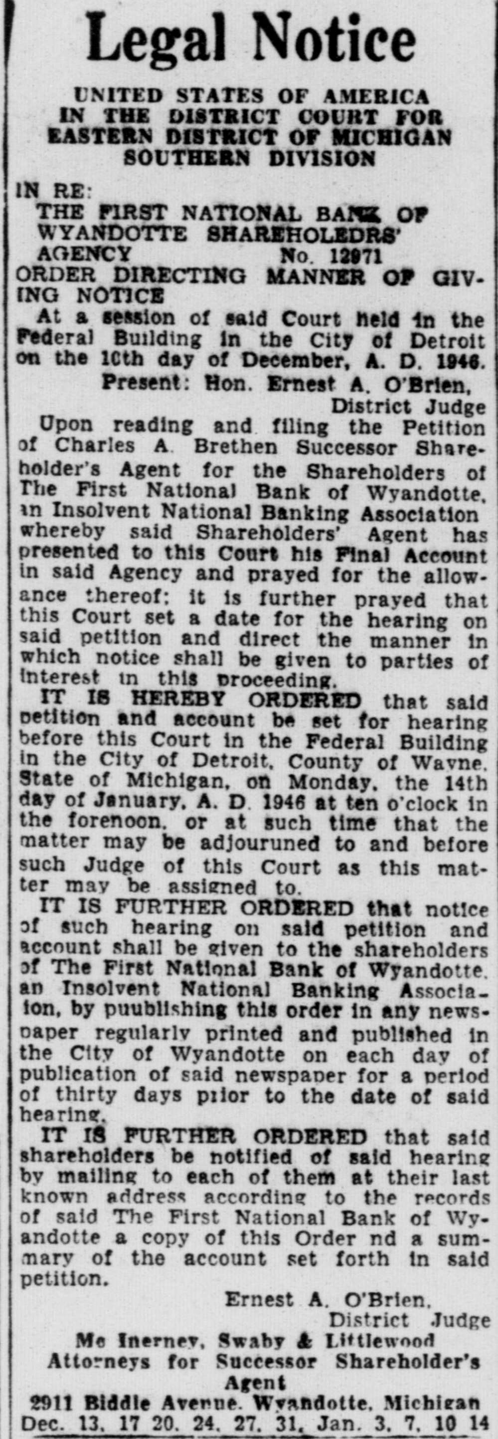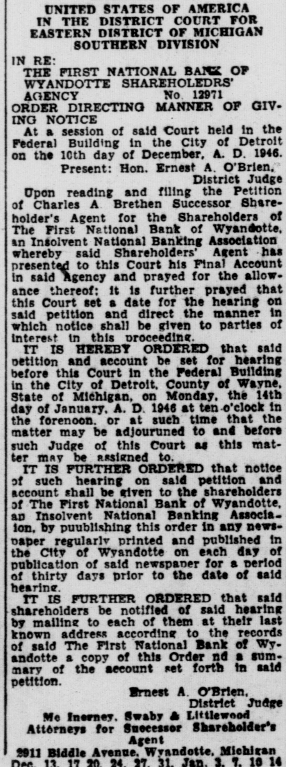 Legal Notice UNITED STATES OF AMERICA IN THE DISTRICT COURT FOR EASTERN DISTRICT OF MICHIGAN SOUTHERN DIVISION IN RE: THE FIRST NATIONAL BANK OF WYANDOTTE SHAREHOLEDRS' AGENCY No. 12971 ORDER DIRECTING MANNER OF GIVING NOTICE At a session of said Court held in the Federal Building in the City of Detroit on the 10th day of December, A. D. 1946. Present: Hon. Ernest A. O'Brien, District Judge Upon reading and filing the Petition of Charles A. Brethen Successor Shareholder's Agent for the Shareholders of The First National Bank of Wyandotte, in Insolvent National Banking Association whereby said Shareholders' Agent has presented to this Court his Final Account in said Agency and prayed for the allowance thereof: it is further prayed that this Court set a date for the hearing on said petition and direct the manner in which notice shall be given to parties of Interest in this proceeding. IT IS HEREBY ORDERED that said petition and account be set for hearing before this Court in the Federal Building in the City of Detroit, County of Wayne. State of Michigan, on Monday. the 14th day of January, A. D. 1946 at ten o'clock in the forenoon. or at such time that the matter may be adjouruned to and before such Judge of this Court as this matter may be assigned to. IT IS FURTHER ORDERED that notice of such hearing on said petition and account shall be given to the shareholders of The First National Bank of Wyandotte. an Insolvent National Banking Associaion, by puublishing this order in any newspaper regularly printed and published in the City of Wyandotte on each day of publication of said newspaper for a period of thirty days prior to the date of said hearing. IT IS FURTHER ORDERED that said shareholders be notified of said hearing by mailing to each of them at their last known address according to the records of said The First National Bank of Wyandotte a copy of this Order nd a summary of the account set forth in said petition. Ernest A. O'Brien, District Judge Me Inerney, Swaby & Littlewood Attorneys for Successor Shareholder's Agent 2911 Biddle Avenue. Wyandotte, Michigan Dec. 13, 17 20. 24. 27. 31, Jan. 3. 7, 10 14
