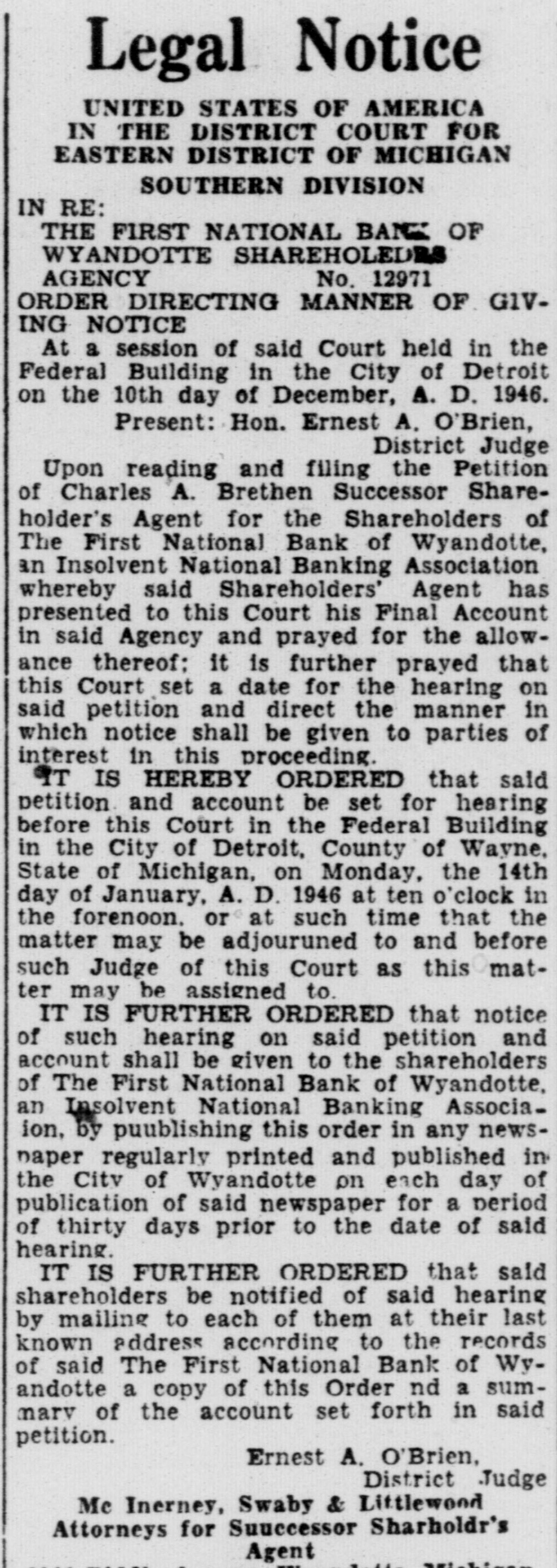 Legal Notice UNITED STATES OF AMERICA IN THE DISTRICT COURT FOR EASTERN DISTRICT OF MICHIGAN SOUTHERN DIVISION IN RE: THE FIRST NATIONAL BANK OF WYANDOTTE SHAREHOLEDR AGENCY No. 12971 ORDER DIRECTING MANNER OF GIVING NOTICE At a session of said Court held in the Federal Building in the City of Detroit on the 10th day of December, A. D. 1946. Present: Hon. Ernest A. O'Brien, District Judge Upon reading and filing the Petition of Charles A. Brethen Successor Shareholder's Agent for the Shareholders of The First National Bank of Wyandotte, an Insolvent National Banking Association whereby said Shareholders' Agent has presented to this Court his Final Account in said Agency and prayed for the allowance thereof: it is further prayed that this Court set a date for the hearing on said petition and direct the manner in which notice shall be given to parties of interest in this proceeding. IT IS HEREBY ORDERED that said petition and account be set for hearing before this Court in the Federal Building in the City of Detroit, County of Wayne, State of Michigan, on Monday, the 14th day of January, A. D. 1946 at ten o'clock in the forenoon. or at such time that the matter may be adjouruned to and before such Judge of this Court as this matter may be assigned to. IT IS FURTHER ORDERED that notice of such hearing on said petition and account shall be given to the shareholders of The First National Bank of Wyandotte, an Insolvent National Banking Associaion, by puublishing this order in any newspaper regularly printed and published in the City of Wyandotte on each day of publication of said newspaper for a period of thirty days prior to the date of said hearing. IT IS FURTHER ORDERED that said shareholders be notified of said hearing by mailing to each of them at their last known address according to the records of said The First National Bank of Wyandotte a copy of this Order nd a summary of the account set forth in said petition. Ernest A. O'Brien, District Judge Mc Inerney, Swaby & Littlewood Attorneys for Suuccessor Sharholdr's Agent