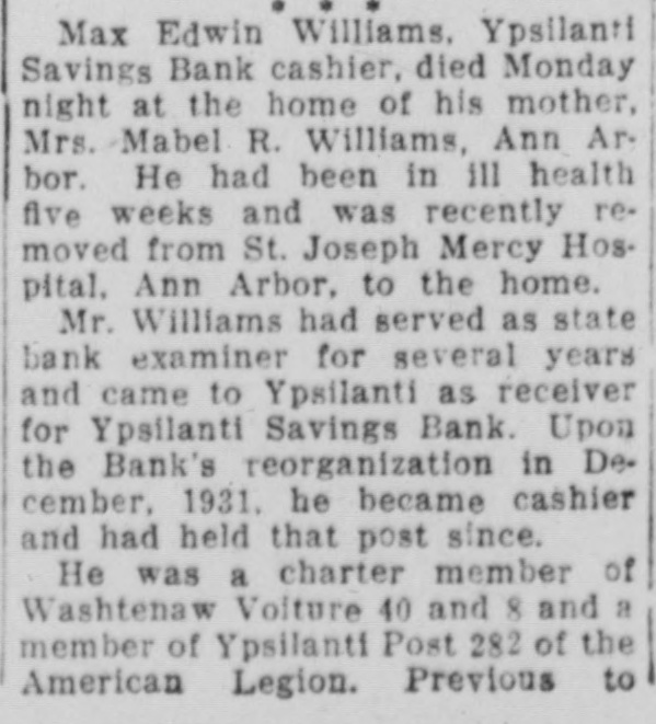 Max Edwin Williams. Ypsilanti Savings Bank cashier, died Monday night at the home of his mother, Mrs. Mabel R. Williams, Ann Arbor. He had been in ill health five weeks and was recently removed from St. Joseph Mercy Hospital, Ann Arbor, to the home. Mr. Williams had served as state bank examiner for several years and came to Ypsilanti as receiver for Ypsilanti Savings Bank. Upon the Bank's reorganization in December, 1931. he became cashier and had held that post since. He was a charter member of Washtenaw Volture 40 and 8 and a member of Ypsilanti Post 282 of the American Legion. Previous to
