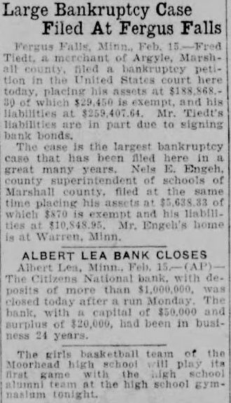 Large Bankruptcy Case Filed At Fergus Falls of Argyle, all tion his at in due to signing bank case the largest case been filed a great years. E. county Marshall at time his $870 home at Minn ALBERT LEA BANK CLOSES The National posits of more than today after run of had in girls team of the high school