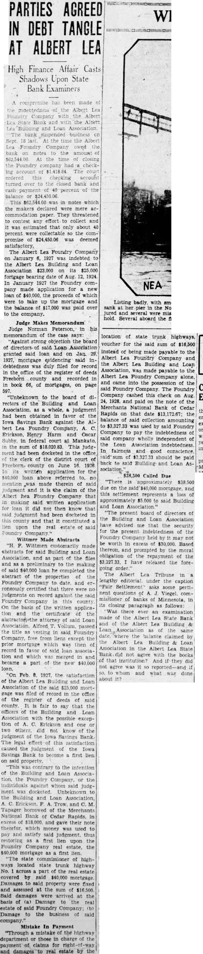 PARTIES AGREED IN DEBT TANGLE AT ALBERT LEA Finance Affair Casts Shadows Upon State Examiners compromise has been made the mdebtedness the Albert Lea Foundry Company with the Albert State Bank and with the Albert Building and Loan Association. bank suspended business Sept. the time the Albert Lea Foundry Company owed the bank on notes the amount of $62,544.00 At the time of closing the Foundry company had checking account of $1,418.84 The ordered this checking account turned over to the closed bank and payment percent of the balance or This in notes which the makers declared were mere accommodation paper. They threatened to contest any effort to collect and was estimated that only about percent were collectable so the promise of $24,450.06 was deemed satisfactory. The Albert Lea Foundry Company on January 6, 1927 was indebted to the Albert Lea Building and Loan Association $23,000 on its $25,000 fortgage bearing date of Aug. 12, 1924. In January 1927 the Foundry company made application for new loan of the proceeds of which to take up the mortgage and the balance of $17,000 was paid over sank at jured and to the company. Judge Makes Memorandum Judge Norman Peterson, in his memorandum of the case says: "Against strong objection the board of directors said Loan Association granted said loan and on Jan. 1927, mortgage evidencing said indebtedness was duly filed for record in the office of the register of deeds Freeborn county and recorded in in book 66, of mortgages, on page 597. "Unbeknown to the board of directors of the Building and Loan Association. as whole, judgment had been obtained in favor of the Iowa Savings Bank against the A1bert Lea Foundry Company, Erickson, Henry Harm and Oscar Subby, in federal court at Mankato, the sum of $18,020.83. This judgment had been docketed in the office the clerk of the district court of Freeborn. county on June 16. 1926 In its written application for the $40,000 loan above referred to, no mention was made therein of said judgment and it the claim of the Albert hea Foundry Company that in making said written application for loan did not then know that said judgment had been docketed in this county and that it constituted lien upon the real estate of said Foundry Company Wittmer Made Abstracts Wittmen customarily made abstracts for said Building and Loan Association and as part of the files and as preliminary to the making of said loan he completed the abstract of the properties of the Foundry Company to date. and erroneously certified that there were judgments on record against the said Foundry Company in this county. On the basis of the written application and the certificate of the abstractorywthe attorney of said Loan Association Alfred Vollum, passed the title as vesting in said Foundry Company, free from liens except the prior mortgage which was then of record in favor of said loan association and which was merged in and became part of the new $40,000 loan. "On Feb. 1927. the satisfaction of the Albert Lea Building and Loan Association of the said $25,000 mortgage was filed of record in the office of the register of deeds of said county. fair to say that the officers of the Building and Loan Association with the possible exception of Erickson and one or two others, did not know of the judgment of the Iowa Savings Bank. The legal this satisfaction caused the judgment of the Iowa Savings Bank to become first lien on said property. was contrary to the intention of the Building and Loan Association, the Foundry Company, or the individuals against whom said judgment was docketed. Unbeknown the Building and Loan Association, Tapager borrowed of the Merchants National Bank of Cedar Rapids, in excess of $18,000. and gave their note therefor. which money was used pay and satisfy said judgment. thus restoring as first lien upon the Foundry Company real estate, the $40,000 mortgage first lien. "The state commissioner of highways located state trunk highway No. across part of the real estate covered by said mortgage Damages to said property fixed and assessed at the sum of $16,500. Said damages were arrived at the basis of Damage to the real estate of said Foundry Company: (b) Damage to the business of said company." Mistake In Payment "Through mistake of the highway department or those in charge of the payment claims for and damages real estate by the location of state trunk highways, voucher for the said sum of $16,500 instead of being made payable to the Albert Lea Foundry Company and the Albert Lea Building and Loan Association, was made payable to the Albert Lea Foundry Company alone, and came into the possession of the said Foundry Company. The Foundry Company cashed this check on Aug. 24, 1928, and paid on the note of the Merchants National Bank of Cedar Rapids on that date $13,172.67; the balance of said collection amounting to was used by said Foundry Company to pay the indebtedness of said company wholly independent of the Loan Association indebtedness. ing In fairness and good conscience of $3,327.33 should be paid back to said Building and Loan Association. $38,500 Called Due "There approximately $38,500 due on the mortgage, and this settlement represents loss approximately to said Building and Loan "The present board of directors of the Building and Loan Association have advised me that the security for the present indebtedness of the Foundry Company held by may not be worth in excess of $30,000. Based thereon, and prompted by the moral obligation of the repayment the have released the foregoing order." The Albert Lea Tribune in lengthy editorial under the caption "Fair Settlement asks some pertinent questions of Viegel. commissioner of banks of Minnesota, in its closing paragraph as follows: "Was there ever an examination made of the Albert Lea State Bank and of the Albert Lea Building Loan Association of the same date. where the balance claimed by the Albert Lea Building & Loan Association the Albert Lea State not agree with the books of th