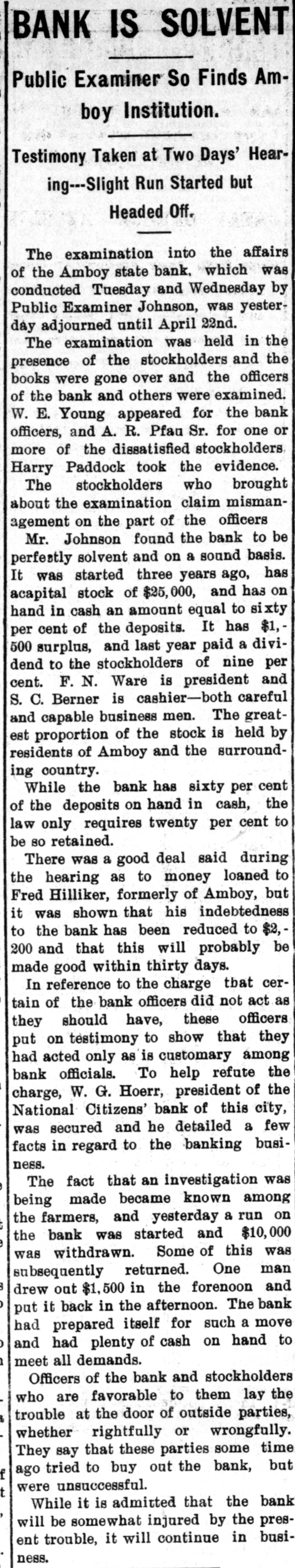 BANK IS SOLVENT Public Examiner So Finds Amboy Institution. Testimony Taken at Two Days' Hearing---Slight Run Started but Headed Off. The examination into the affairs of the Amboy state bank. which was conducted Tuesday and Wednesday by Public Examiner Johnson, was yesterday adjourned until April 22nd. The examination was held in the presence of the stockholders and the books were gone over and the officers of the bank and others were examined. W. E. Young appeared for the bank officers, and A. R. Pfau Sr. for one or more of the dissatisfied stockholders Harry Paddock took the evidence. The stockholders who brought about the examination claim mismanagement on the part of the officers Mr. Johnson found the bank to be perfectly solvent and on a sound basis. It was started three years ago, has acapital stock of $25,000, and has on hand in cash an amount equal to sixty per cent of the deposits. It has $1,500 surplus, and last year paid a dividend to the stockholders of nine per cent. F. N. Ware is president and S. C. Berner is cashier-both careful and capable business men. The greatest proportion of the stock is held by residents of Amboy and the surrounding country. While the bank has sixty per cent of the deposits on hand in cash, the law only requires twenty per cent to be so retained. There was a good deal said during the hearing as to money loaned to Fred Hilliker, formerly of Amboy, but it was shown that his indebtedness to the bank has been reduced to $2,200 and that this will probably be made good within thirty days. In reference to the charge tbat certain of the bank officers did not act as they should have, these officers put on testimony to show that they had acted only as is customary among bank officials. To help refute the charge, W. G. Hoerr, president of the National Citizens' bank of this city, was secured and he detailed a few facts in regard to the banking business. The fact that an investigation was being made became known among the farmers, and yesterday a run on the bank was started and $10,000 was withdrawn. Some of this was subsequently returned. One man drew out $1,500 in the forenoon and put it back in the afternoon. The bank had prepared itself for such a move and had plenty of cash on hand to meet all demands. Officers of the bank and stockholders who are favorable to them lay the trouble at the door of outside parties, whether rightfully or wrongfully. They say that these parties some time ago tried to buy out the bank, but were unsuccessful. While it is admitted that the bank will be somewhat injured by the present trouble, it will continue in business.