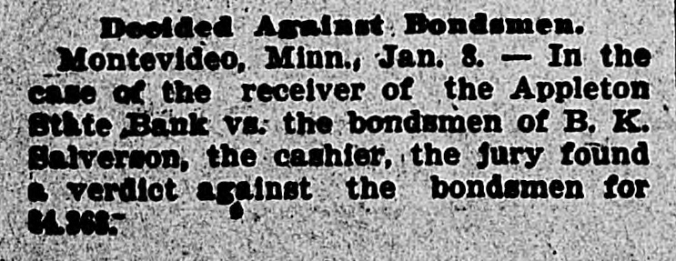 Decided Against Bondsmen. Montevideo, Minn., Jan. 8. - In the case of the receiver of the Appleton State Bank vs. the bondsmen of B. K. Salverson, the cashier, the jury found a verdict against the bondsmen for 84.368.7