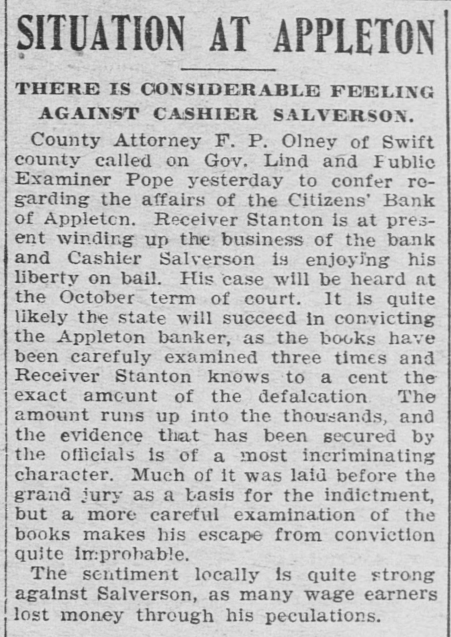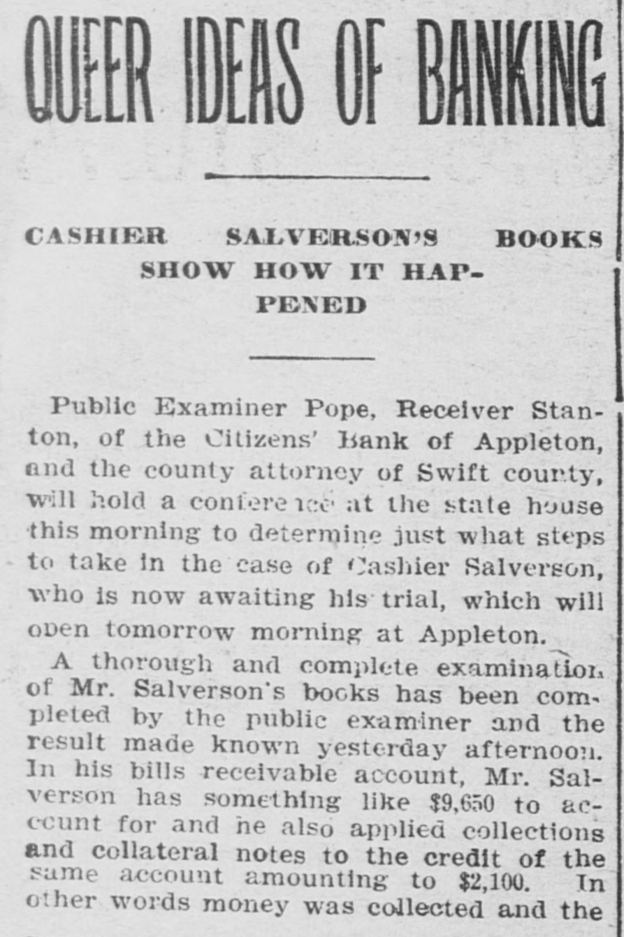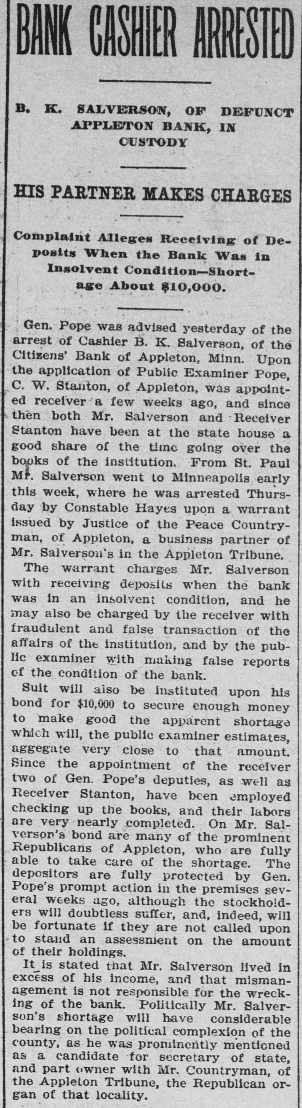 BANK CASHIER ARRESTED B. K. SALVERSON, OF DEFUNCT APPLETON BANK, IN CUSTODY HIS PARTNER MAKES CHARGES Complaint Alleges Receiving of Deposits When the Bank Was in Insolvent Condition-Shortage About $10,000. Gen. Pope was advised yesterday of the arrest of Cashier B. K. Salverson, of the Citizens' Bank of Appleton, Minn. Upon the application of Public Examiner Pope, C. W. Stanton, of Appleton, was appointed receiver' a few weeks ago, and since then both Mr. Salverson and Receiver Stanton have been at the state house a good share of the time going over the books of the institution. From St. Paul Mr. Salverson went to Minneapolis early this week, where he was arrested Thursday by Constable Hayes upon a warrant issued by Justice of the Peace Countryman, of Appleton, a business partner of Mr. Salverson's in the Appleton Tribune. The warrant charges Mr. Salverson with receiving deposits when the bank was in an insolvent condition, and he may also be charged by the receiver with fraudulent and false transaction of the affairs of the institution, and by the public examiner with making false reports of the condition of the bank. Suit will also be instituted upon his bond for $10,000 to secure enough money to make good the apparent shortage which will, the public examiner estimates, aggegate very close to that amount. Since the appointment of the receiver two of Gen. Pope's deputies, as well as Receiver Stanton, have been employed checking up the books, and their labors are very nearly completed. On Mr. Salverson's bond are many of the prominent Republicans of Appleton, who are fully able to take care of the shortage. The depositors are fully protected by Gen. Pope's prompt action in the premises several weeks ago, although the stockholders will doubtless suffer, and, indeed, will be fortunate if they are not called upon to stand an assessment on the amount of their holdings. It is stated that Mr. Salverson lived in excess of his income, and that mismanagement is not responsible for the wrecking of the bank. Politically Mr. Salverson's shortage will have considerable bearing on the political complexion of the county, as he was prominently mentioned as a candidate for secretary of state, and part owner with Mr. Countryman, of the Appleton Tribune, the Republican organ of that locality.