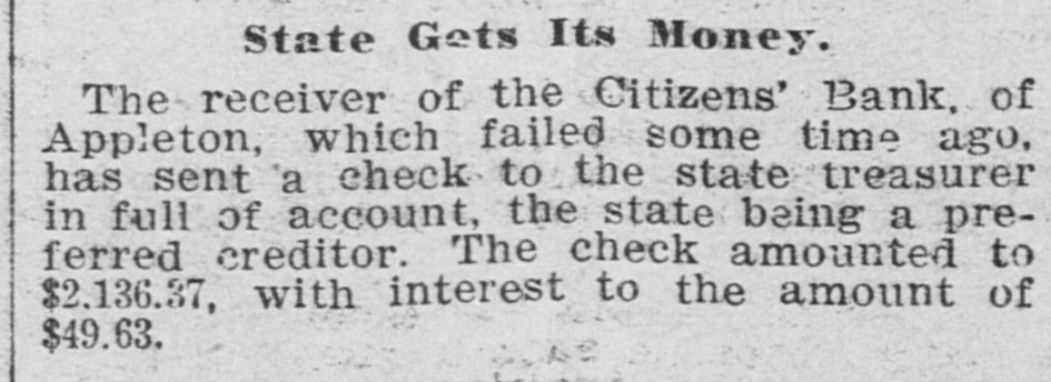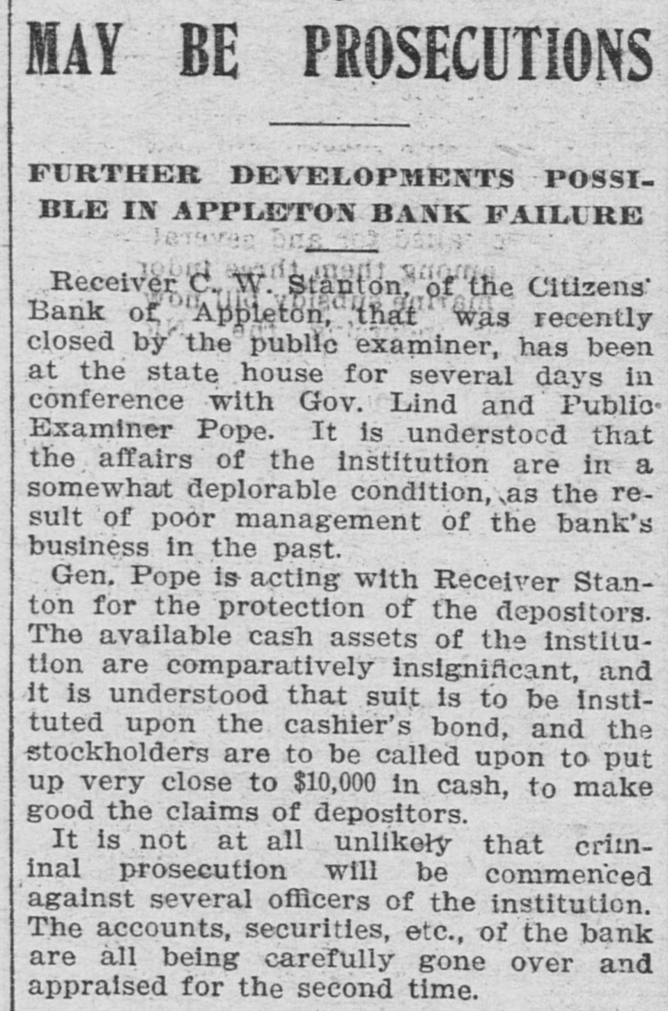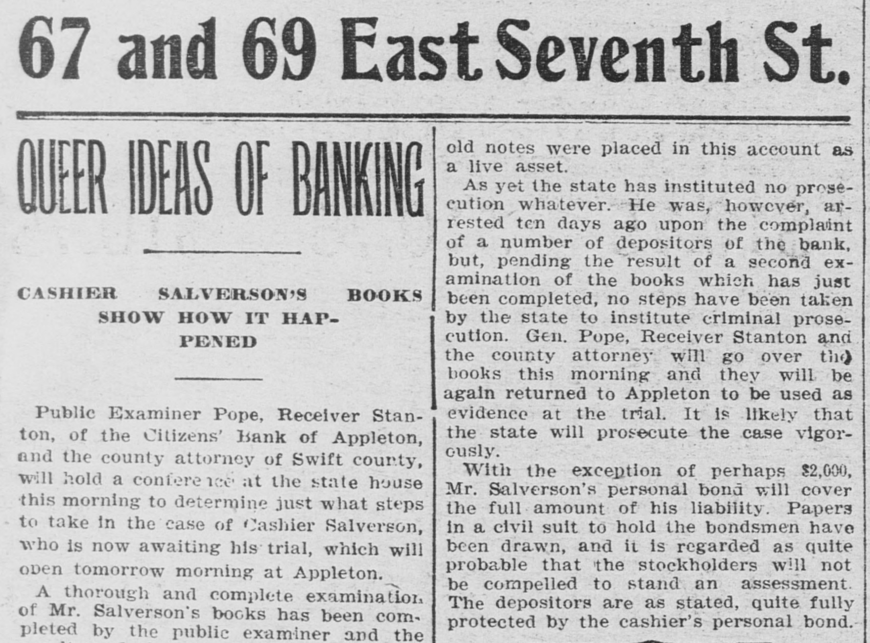 BANK CASHIER ARRESTED B. K. SALVERSON, OF DEFUNCT APPLETON BANK, IN CUSTODY HIS PARTNER MAKES CHARGES Complaint Alleges Receiving of Deposits When the Bank Was in Insolvent Condition-Shortage About $10,000. Gen. Pope was advised yesterday of the arrest of Cashier B. K. Salverson, of the Citizens' Bank of Appleton, Minn. Upon the application of Public Examiner Pope, C. W. Stanton, of Appleton, was appointed receiver' a few weeks ago, and since then both Mr. Salverson and Receiver Stanton have been at the state house a good share of the time going over the books of the institution. From St. Paul Mr. Salverson went to Minneapolis early this week, where he was arrested Thursday by Constable Hayes upon a warrant issued by Justice of the Peace Countryman, of Appleton, a business partner of Mr. Salverson's in the Appleton Tribune. The warrant charges Mr. Salverson with receiving deposits when the bank was in an insolvent condition, and he may also be charged by the receiver with fraudulent and false transaction of the affairs of the institution, and by the public examiner with making false reports of the condition of the bank. Suit will also be instituted upon his bond for $10,000 to secure enough money to make good the apparent shortage which will, the public examiner estimates, aggegate very close to that amount. Since the appointment of the receiver two of Gen. Pope's deputies, as well as Receiver Stanton, have been employed checking up the books, and their labors are very nearly completed. On Mr. Salverson's bond are many of the prominent Republicans of Appleton, who are fully able to take care of the shortage. The depositors are fully protected by Gen. Pope's prompt action in the premises several weeks ago, although the stockholders will doubtless suffer, and, indeed, will be fortunate if they are not called upon to stand an assessment on the amount of their holdings. It is stated that Mr. Salverson lived in excess of his income, and that mismanagement is not responsible for the wrecking of the bank. Politically Mr. Salverson's shortage will have considerable bearing on the political complexion of the county, as he was prominently mentioned as a candidate for secretary of state, and part owner with Mr. Countryman, of the Appleton Tribune, the Republican organ of that locality.