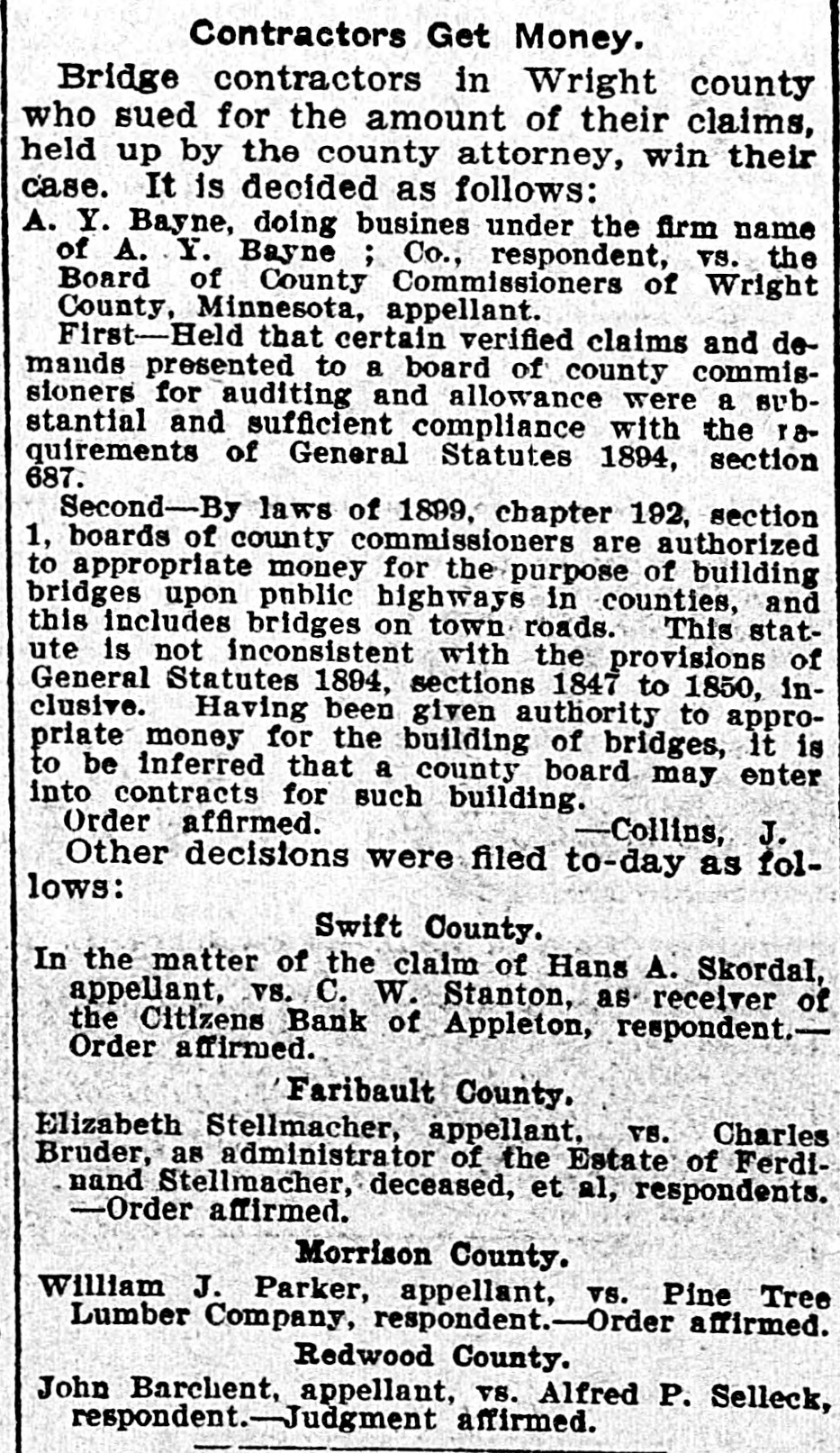 Contractors Get Money. Bridge contractors in Wright county who sued for the amount of their claims, held up by the county attorney, win their case. It is decided as follows: A. Y. Bayne, doing busines under the firm name of A. Y. Bayne ; Co., respondent, vs. the Board of County Commissioners of Wright County, Minnesota, appellant. First-Held that certain verified claims and demands presented to a board of county commissioners for auditing and allowance were a substantial and sufficient compliance with the raquirements of General Statutes 1894, section 687. Second-By laws of 1899, chapter 192, section 1, boards of county commissioners are authorized to appropriate money for the purpose of building bridges upon public highways in counties, and this includes bridges on town roads. This statute is not inconsistent with the provisions of General Statutes 1894, sections 1847 to 1850, inclusive. Having been given authority to appropriate money for the building of bridges, it is to be inferred that a county board may enter into contracts for such building. Order affirmed. -Collins, J. Other decisions were filed to-day as follows: Swift County. In the matter of the claim of Hans A. Skordal, appellant, vs. C. W. Stanton, as receiver of the Citizens Bank of Appleton, respondent.Order affirmed. Faribault County. Elizabeth Stellmacher, appellant. vs. Charles Bruder, as administrator of the Estate of Ferdinand Stellmacher, deceased, et al, respondents. -Order affirmed. Morrison County. William J. Parker, appellant, vs. Pine Tree Lumber Company, respondent.-Order affirmed. Redwood County. John Barchent, appellant, vs. Alfred P. Selleck, respondent.-Judgment affirmed.
