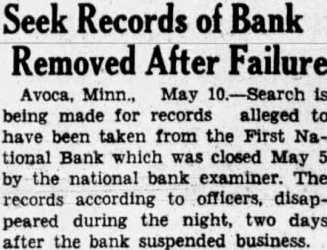 Seek Records of Bank Removed After Failure Avoca, Minn., May 10.-Search is being made for records alleged to have been taken from the First National Bank which was closed May 5 by the national bank examiner. The records according to officers, disappeared during the night, two days after the bank suspended business.