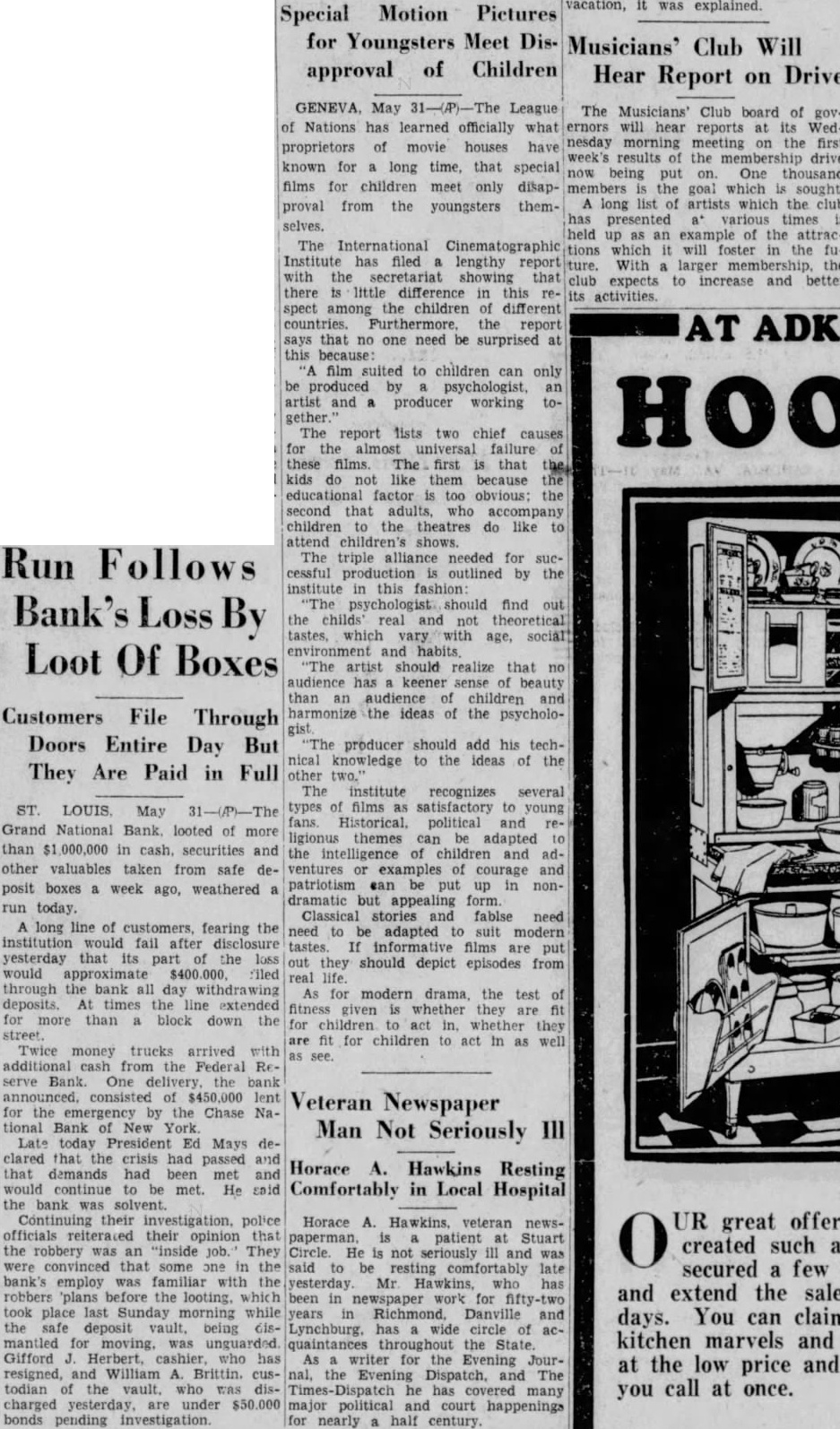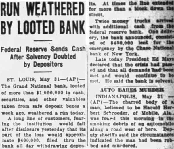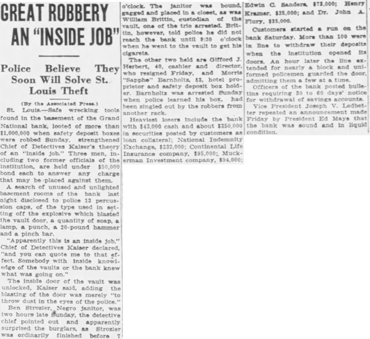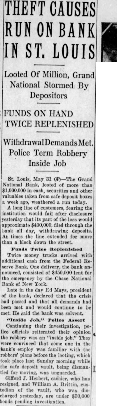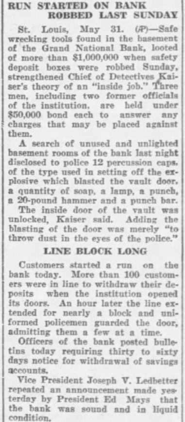 LOUIS BANK LOOTING CALLED AN INSIDE Tools Are Found in Basement SUSPECTS HELD Chief of Detectives Declares Some Person in Bank "Knew What Going On" Associated St. Louis, May tools, found in the basement of the Grand National bank, looted of more than one million dollars when safe deposit boxes were robbed Sunday, strengthened Chief of Detectives Kaiser's theory of an "inside job." Three men, including two former officials of the institution, are held under $50,000 bond each, to answer any charge that may be placed against them. search of the unused and unlighted basement rooms of the bank last night disclosed police 12 percussion caps of the type used in setting the explosive which blasted the vault door, quantity of soap, lamp, punch, pound hammer and pinch bar. "Apparently this is an inside job," Chief of Detectives Kaiser declared, "and you can quote me to that effect.' Somebody with inside knowledge of the vaults or bank knew what was ing The inside door of the vault was unlocked, Kaiser said, adding the blasting of the door was merely to "throw dust in the eyes of the police." Start "Run" on Bank Customers started run on the bank today. More than 100 customers in line to withdraw their deposits when the institution opened its doors. An hour later the line extended for nearly block and uniformed policemen guarded the door, admitting them few The Federal Reserve bank sent $250,000 to the institution two days ago, in anticipation of withdrawals. Declares Bank Solvent Officers of the bank posted bulletins today requiring 30 to 60 days' notice for withdrawal of savings accounts. Vice President Joseph Ledbetter repeated an announcement made yesterday by President Ed Mays, that the bank was sound and in liquid condition.