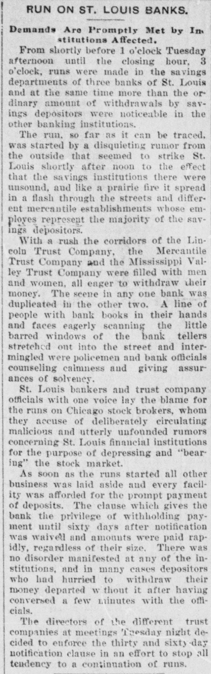 ST. LOUISANS ARE ALARMED 1 Runs Made on Three Savings Banks. ORS PAID IN FULL DEP 0 als Say They are Ready to Meet Demands. THE by &umor Said to Have Originated in Chicago Concerning Solvency of the Institutions Started the Trouble. St. Louis, Oct. 27.-From shortly before 1 o'clock until the closing hour (3 o'clock) today runs were made in the savings departments of three banks of St. Louis, and at the same time more than the ordinary amount of withdrawals by savings depositors were noticeable in the other banking institutions. The run, so far as it can be traced, was started by a disquieting rumor from the outside that seemed to strike St. Louis shortly after noon, to the effect that the savings institutions here were unsound, and like a prairie fire it spread through the streets and different mercantile establishments, whose employes represent the majority of savings depositors. Eager for Their Money. With a rush the corridors of the Lincoin Trust Company. the Mercantile Trust Company and the Mississippi Valley Trust Company were filled with men and women all eager to withdraw their money. At each of these banks a line of people with bank books in their hands stretched out into the street and intermingled with policemen and bank officials counseling calmness and giving assurances of solvency. It is stated that the rumor that started the run came from Chicago, and was to the effect that two directors of the Mississippi Valley Trust Company had recently endeavored to negotiate a loan of $2,000,000 in that city and had been refused. Today this rumor was pronounced an absolute canard by the directors concerned. As soon as the runs started all other business was laid aside and every facility was afforded for the prompt payment of deposits. The clauses which gave the bank privilege of withholding payment until sixty days after notification were waived and the amounts were paid rapidly regardless of their size. There was no disorder manifested at any of the institutions and in many cases depositors who had hurried to withdraw amounts departed without their money after having conversed a few moments with the officials and been made confident that the bank would continue to do business. Run Soon Over. At the Missouri Trust Company a number of depositors had collected to demand payment, but the crowd soon thinned, and before 3 o'clock the incipient run had ceased. Presidents of the different national banks assembled during the afternoon, and issued a statement that the banks of St. Louis are all perfectly solvent and amply able to liquidate all demands. All the banks closed at 3 o'clock, the usual closing hour, and gave out word that they will open tomorrow at the usual hour. 10 o'clock, and will meet all demands. The directors of the Mercantile Trust Company, representing several millions of dollars, have signed the following agreement: "We, the Directors of the Mercantile Trust Company, knowing that all its affairs are in sound and safe condition and that every dollar of its obligations of every nature will be met, do hereby bind ourselves individualy to the extent of our individual fortunes, to the payment in full of all current and savings deposits accounts and we do hereby guarantee such payment."