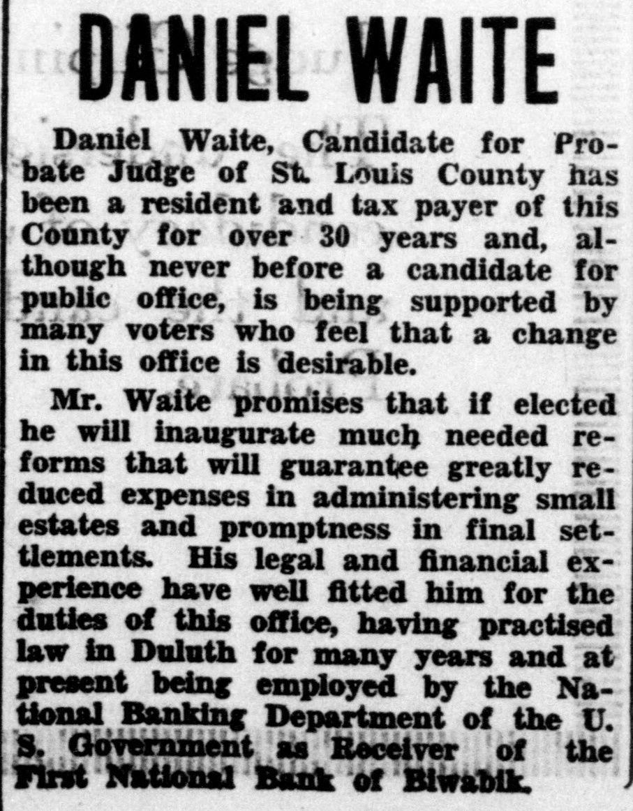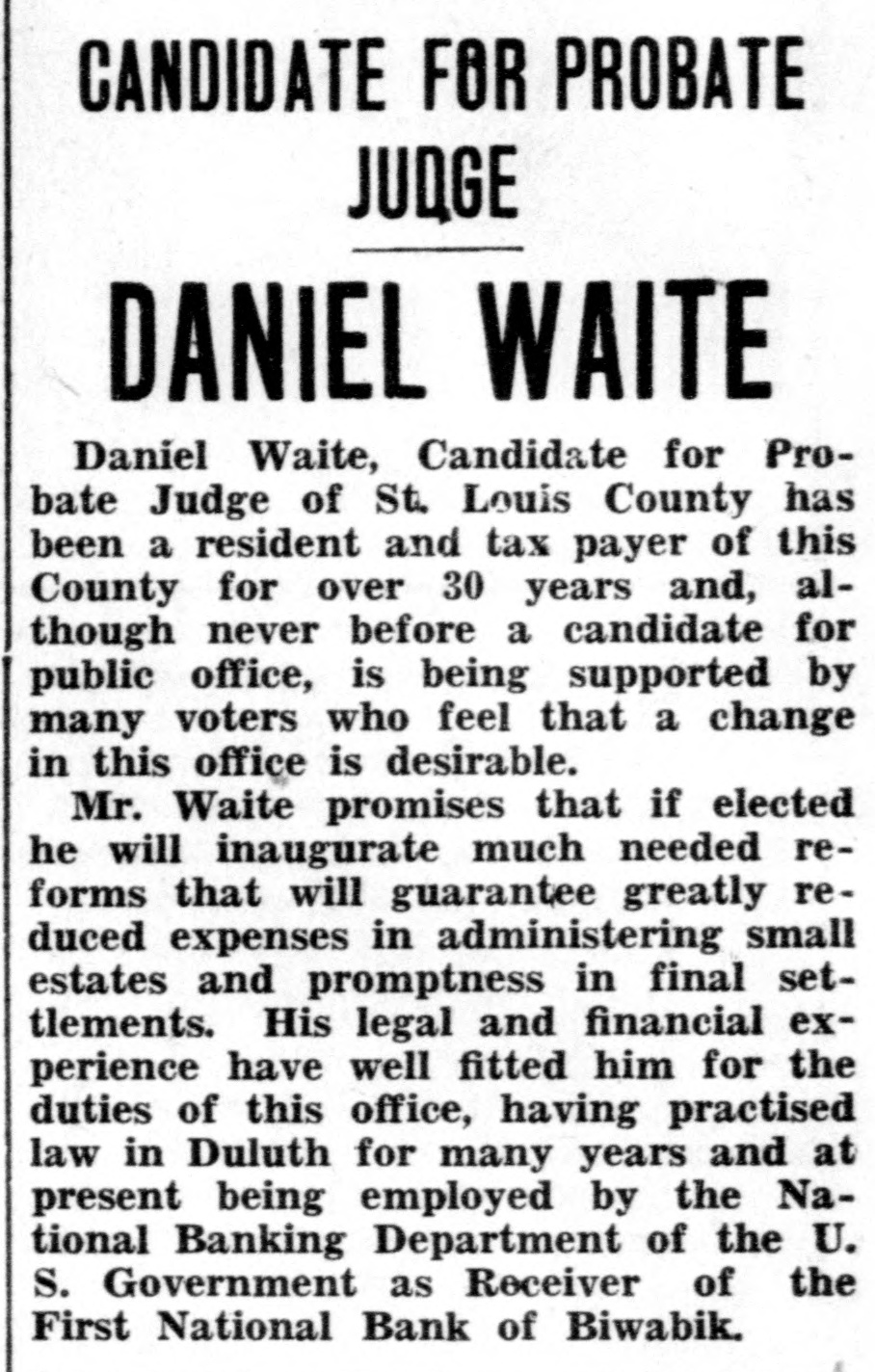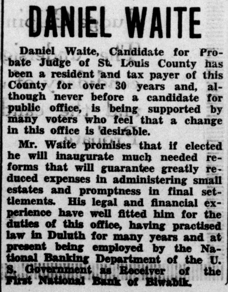 CANDIDATE FOR PROBATE JUDGE DANIEL WAITE Daniel Waite, Candidate for Probate Judge of St. Louis County has been a resident and tax payer of this County for over 30 years and, although never before a candidate for public office, is being supported by many voters who feel that a change in this office is desirable. Mr. Waite promises that if elected he will inaugurate much needed reforms that will guarantee greatly reduced expenses in administering small estates and promptness in final settlements. His legal and financial experience have well fitted him for the duties of this office, having practised law in Duluth for many years and at present being employed by the National Banking Department of the U. S. Government as Receiver of the First National Bank of Biwabik.