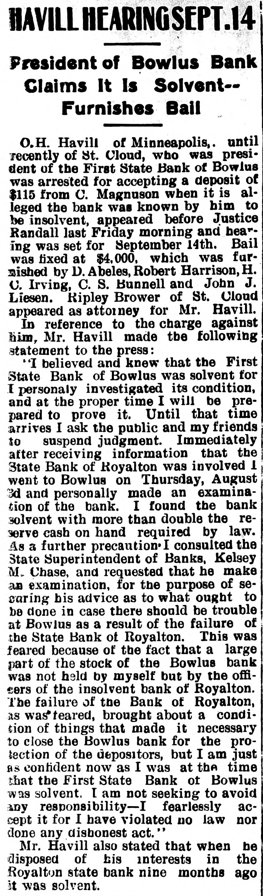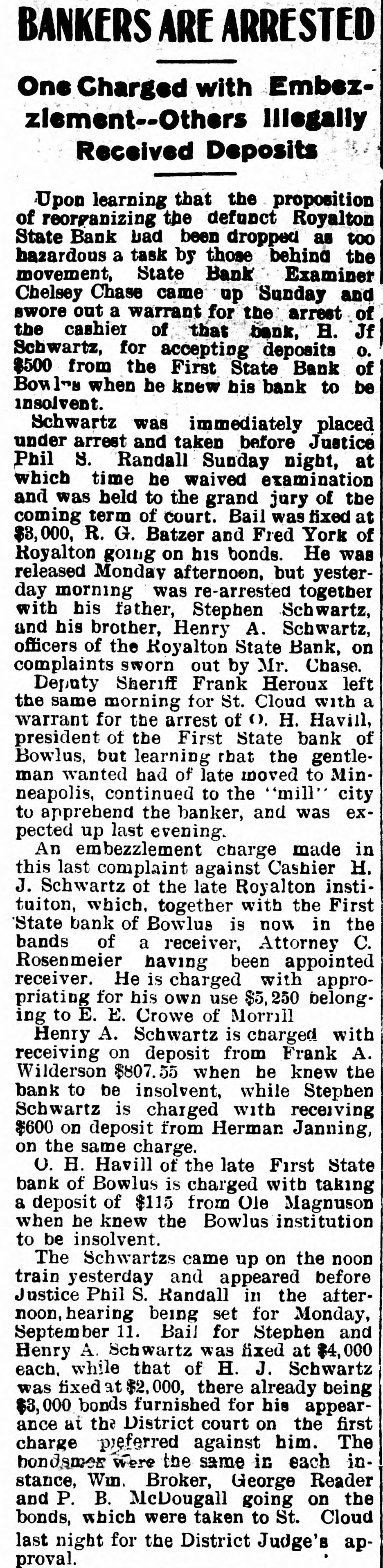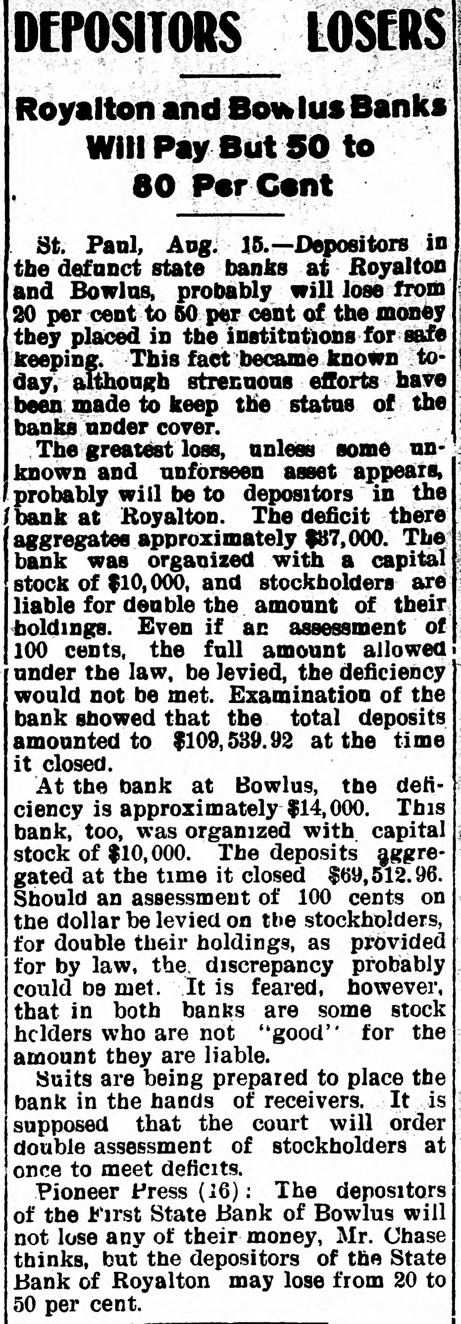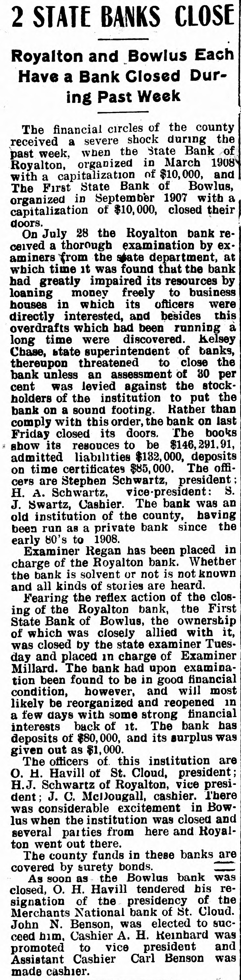 2 STATE BANKS CLOSE Royalton and Bowlus Each Have a Bank Closed During Past Week The financial circles of the county received a severe shock during the past week, when the State Bank of Royalton, organized in March 1908 with a capitalization of $10,000, and The First State Bank of Bowlus, organized in September 1907 with a capitalization of $10,000, closed their doors. On July 28 the Royalton bank received a thorough examination by examiners from the state department, at which time it was found that the bank had greatly impaired its resources by loaning money freely to business houses in which its officers were directly interested, and besides this overdrafts which had been running a long time were discovered. Kelsey Chase, state superintendent of banks, thereupon threatened to close the bank unless an assessment of 30 per cent was levied against the stockholders of the institution to put the bank on a sound footing. Rather than comply with this order, the bank on last Friday closed its doors. The books show its resources to be $146,291.91, admitted liabilities $132,000, deposits on time certificates $85,000. The officers are Stephen Schwartz, president : H. A. Schwartz, vice-president: S. J. Swartz, Cashier. The bank was an old institution of the county, having been run as a private bank since the early 80's to 1908. Examiner Regan has been placed in charge of the Royalton bank. Whether the bank is solvent or not is not known and all kinds of stories are heard. Fearing the reflex action of the closing of the Royalton bank, the First State Bank of Bowlus, the ownership of which was closely allied with it, was closed by the state examiner Tuesday and placed in charge of Examiner Millard. The bank had upon examination been found to be in good financial condition, however, and will most likely be reorganized and reopened in a few days with some strong financial interests back of it. The bank has deposits of $80,000, and its surplus was given out as $1,000. The officers of this institution are O. H. Havill of St. Cloud, president; H.J. Schwartz of Royalton, vice president; J. C. McDougall, cashier. There was considerable excitement in Bowlus when the institution was closed and several parties from here and Royalton went out there. The county funds in these banks are covered by surety bonds. As soon as the Bowlus bank was closed, O. H. Havill tendered his reof the signation presidency of the Merchants National bank of St. Cloud. John N. Benson, was elected to sucCashier A. H. Reinbard was to promoted ceed him. vice president and Assistant Cashier Carl Benson was made cashier.