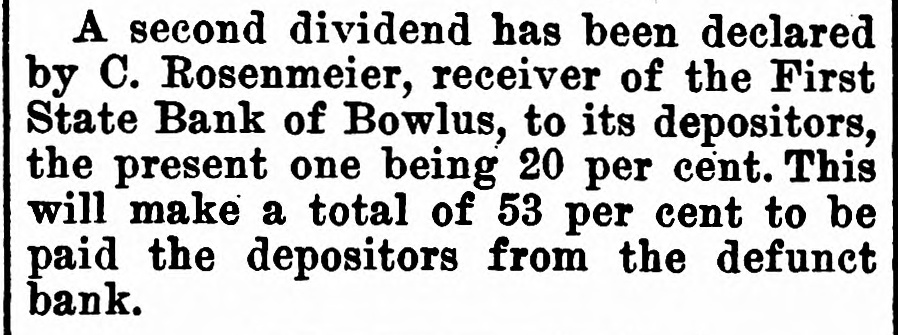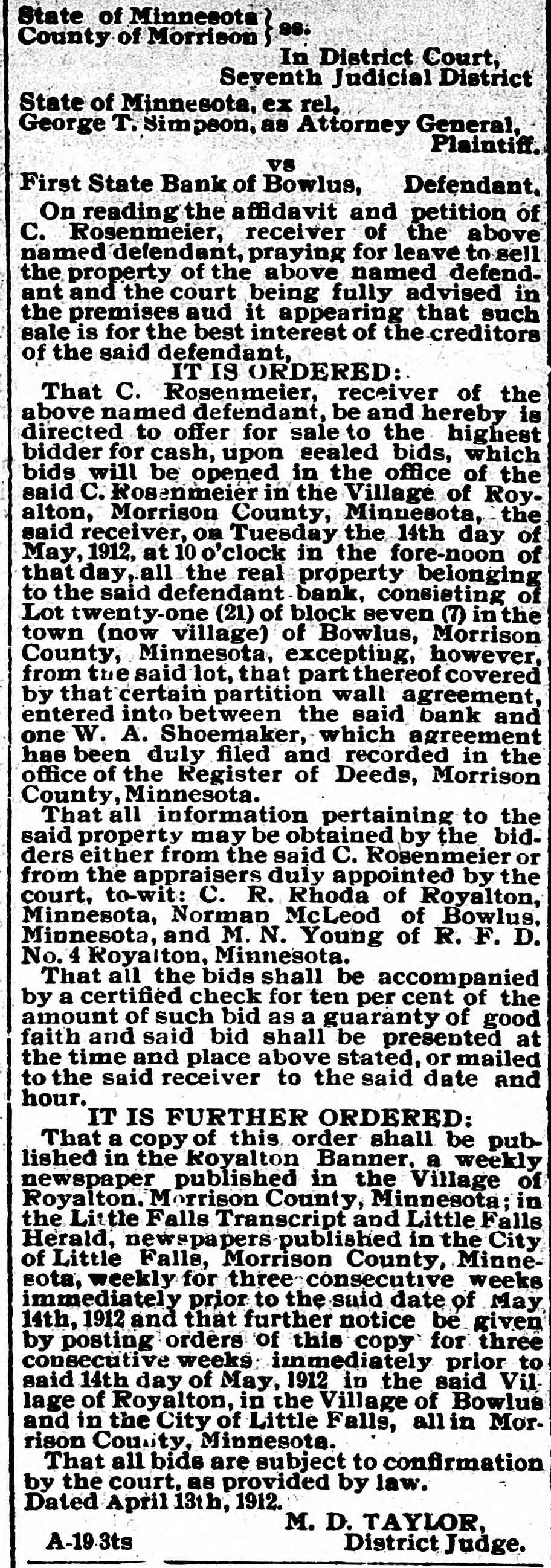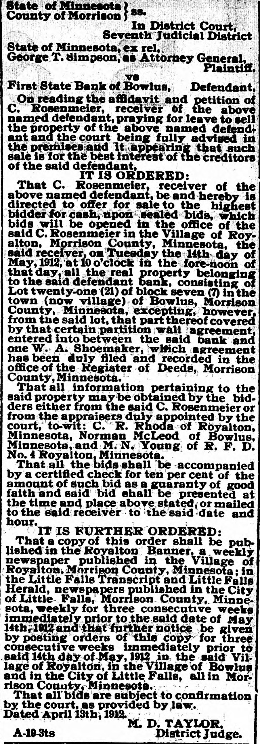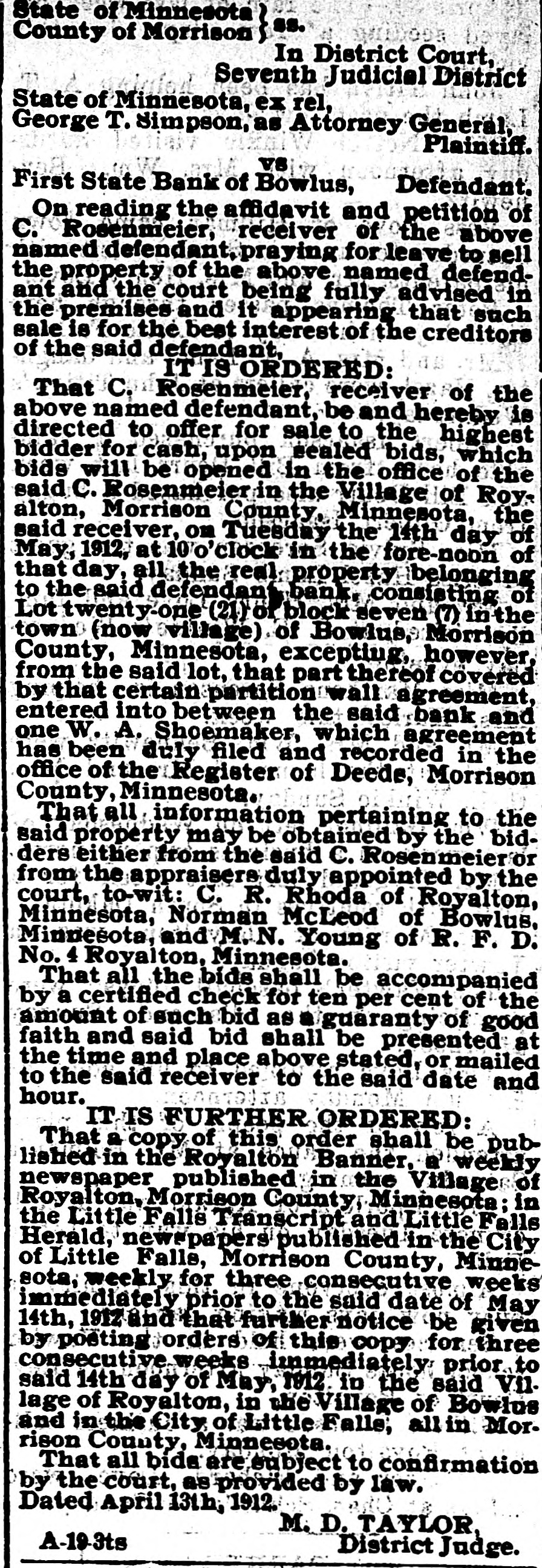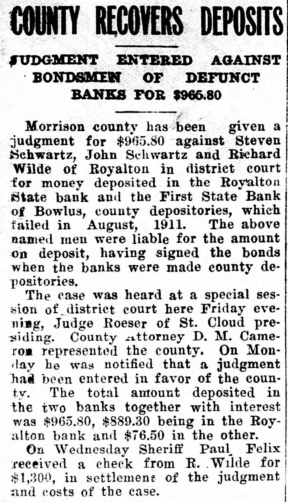 2 STATE BANKS CLOSE Royalton and Bowlus Each Have a Bank Closed During Past Week The financial circles of the county received a severe shock during the past week, when the State Bank of Royalton, organized in March 1908 with a capitalization of $10,000, and The First State Bank of Bowlus, organized in September 1907 with a capitalization of $10,000, closed their doors. On July 28 the Royalton bank received a thorough examination by examiners from the state department, at which time it was found that the bank had greatly impaired its resources by loaning money freely to business houses in which its officers were directly interested, and besides this overdrafts which had been running a long time were discovered. Kelsey Chase, state superintendent of banks, thereupon threatened to close the bank unless an assessment of 30 per cent was levied against the stockholders of the institution to put the bank on a sound footing. Rather than comply with this order, the bank on last Friday closed its doors. The books show its resources to be $146,291.91, admitted liabilities $132,000, deposits on time certificates $85,000. The officers are Stephen Schwartz, president : H. A. Schwartz, vice-president: S. J. Swartz, Cashier. The bank was an old institution of the county, having been run as a private bank since the early 80's to 1908. Examiner Regan has been placed in charge of the Royalton bank. Whether the bank is solvent or not is not known and all kinds of stories are heard. Fearing the reflex action of the closing of the Royalton bank, the First State Bank of Bowlus, the ownership of which was closely allied with it, was closed by the state examiner Tuesday and placed in charge of Examiner Millard. The bank had upon examination been found to be in good financial condition, however, and will most likely be reorganized and reopened in a few days with some strong financial interests back of it. The bank has deposits of $80,000, and its surplus was given out as $1,000. The officers of this institution are O. H. Havill of St. Cloud, president; H.J. Schwartz of Royalton, vice president; J. C. McDougall, cashier. There was considerable excitement in Bowlus when the institution was closed and several parties from here and Royalton went out there. The county funds in these banks are covered by surety bonds. As soon as the Bowlus bank was closed, O. H. Havill tendered his reof the signation presidency of the Merchants National bank of St. Cloud. John N. Benson, was elected to sucCashier A. H. Reinbard was to promoted ceed him. vice president and Assistant Cashier Carl Benson was made cashier.
