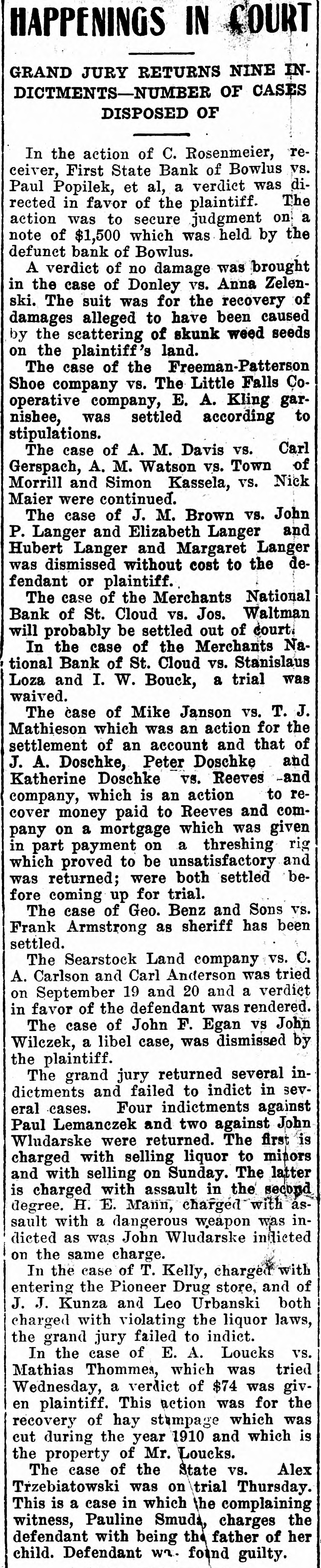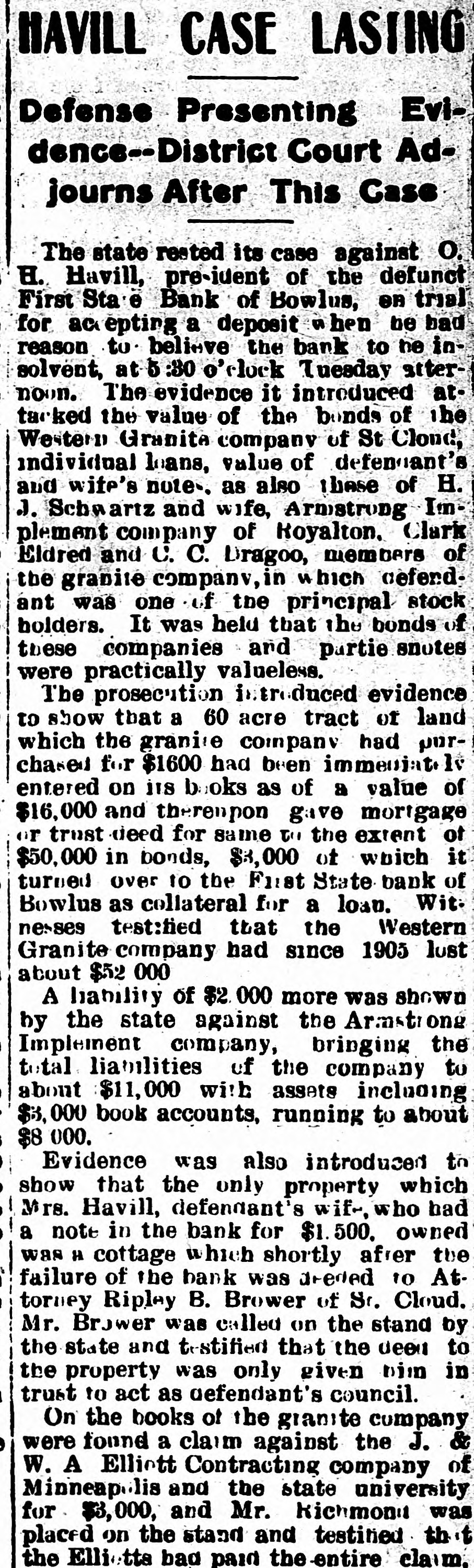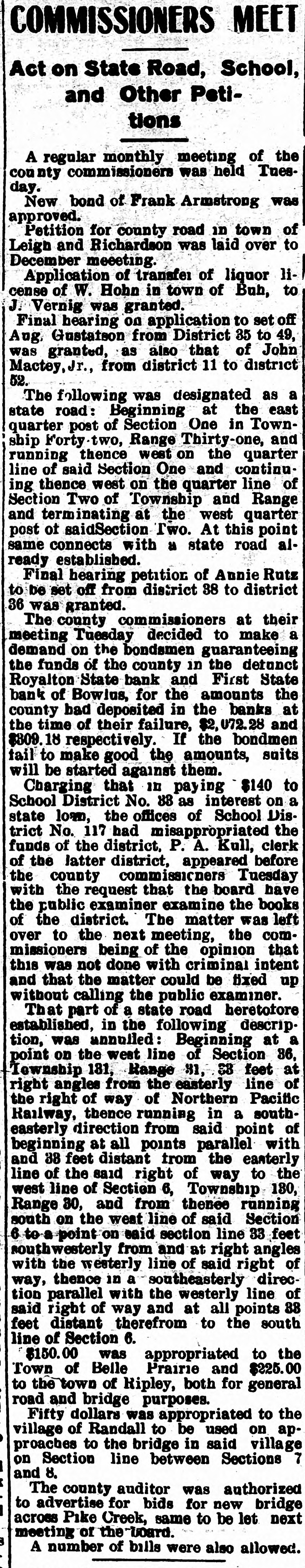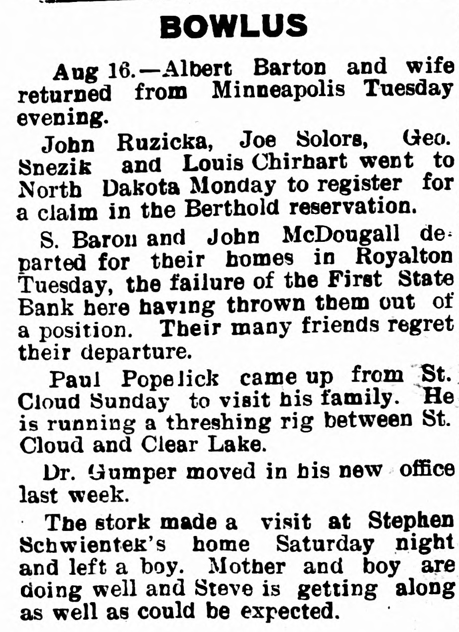 2 STATE BANKS CLOSE Royalton and Bowlus Each Have a Bank Closed During Past Week The financial circles of the county received a severe shock during the past week, when the State Bank of Royalton, organized in March 1908 with a capitalization of $10,000, and The First State Bank of Bowlus, organized in September 1907 with a capitalization of $10,000, closed their doors. On July 28 the Royalton bank received a thorough examination by examiners from the state department, at which time it was found that the bank had greatly impaired its resources by loaning money freely to business houses in which its officers were directly interested, and besides this overdrafts which had been running a long time were discovered. Kelsey Chase, state superintendent of banks, thereupon threatened to close the bank unless an assessment of 30 per cent was levied against the stockholders of the institution to put the bank on a sound footing. Rather than comply with this order, the bank on last Friday closed its doors. The books show its resources to be $146,291.91, admitted liabilities $132,000, deposits on time certificates $85,000. The officers are Stephen Schwartz, president : H. A. Schwartz, vice-president: S. J. Swartz, Cashier. The bank was an old institution of the county, having been run as a private bank since the early 80's to 1908. Examiner Regan has been placed in charge of the Royalton bank. Whether the bank is solvent or not is not known and all kinds of stories are heard. Fearing the reflex action of the closing of the Royalton bank, the First State Bank of Bowlus, the ownership of which was closely allied with it, was closed by the state examiner Tuesday and placed in charge of Examiner Millard. The bank had upon examination been found to be in good financial condition, however, and will most likely be reorganized and reopened in a few days with some strong financial interests back of it. The bank has deposits of $80,000, and its surplus was given out as $1,000. The officers of this institution are O. H. Havill of St. Cloud, president; H.J. Schwartz of Royalton, vice president; J. C. McDougall, cashier. There was considerable excitement in Bowlus when the institution was closed and several parties from here and Royalton went out there. The county funds in these banks are covered by surety bonds. As soon as the Bowlus bank was closed, O. H. Havill tendered his reof the signation presidency of the Merchants National bank of St. Cloud. John N. Benson, was elected to sucCashier A. H. Reinbard was to promoted ceed him. vice president and Assistant Cashier Carl Benson was made cashier.