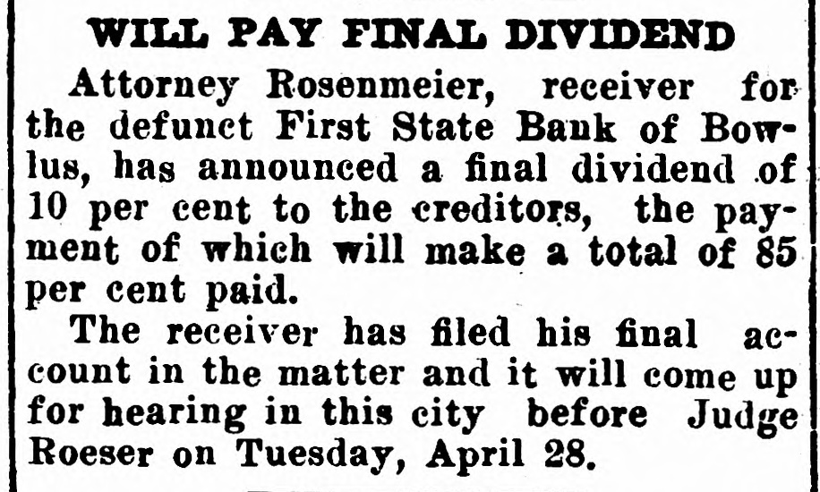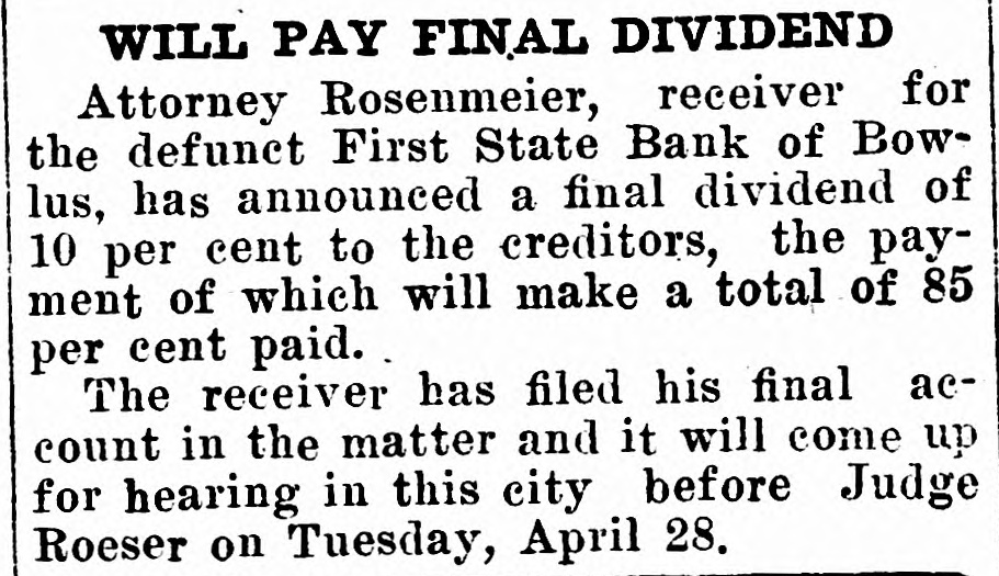 WILL PAY FINAL DIVIDEND Attorney Rosenmeier, receiver for the defunct First State Bank of Bowlus, has announced a final dividend of 10 per cent to the creditors, the payment of which will make a total of 85 per cent paid. The receiver has filed his final account in the matter and it will come up for hearing in this city before Judge Roeser on Tuesday, April 28.