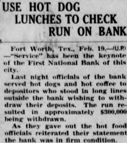 USE HOT DOG LUNCHES TO CHECK RUN ON BANK Fort Feb. has been the keynote of the First National Bank of this city. Last night officials of the bank served hot dogs and hot coffee to depositors who stood in long lines outside the bank wishing to withdraw their deposits. run sulted in approximately $300,000 being withdrawn. they gave the hot food officials reiterated their statement the bank was in firm condition.