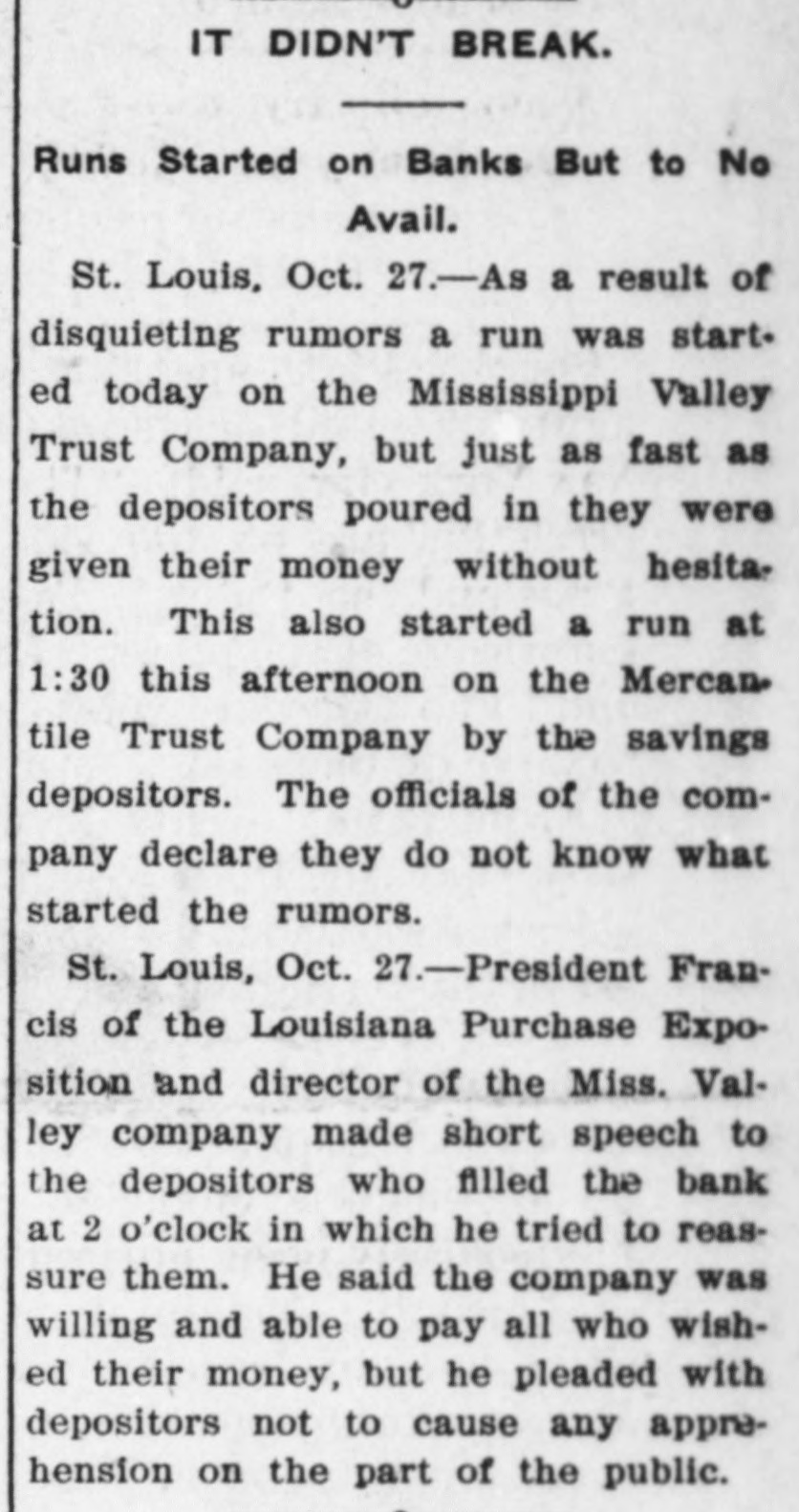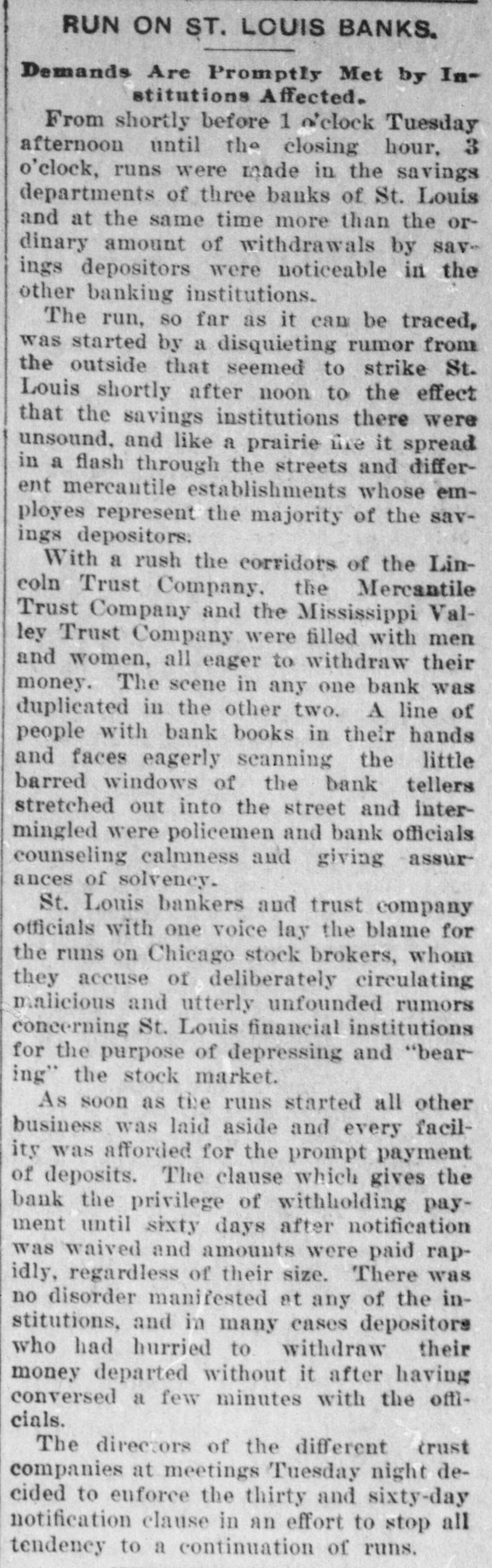 DEPOSITORS ARE AGAIN IN HURRY St, Louis Bank Officials, However, Say Trouble is Over MANY OFFERS OF ASSISTANCE Expression of Confidence and Such Offers on Part of National Banks Has Helped-Long Lines of Depositors. St Louis, October 28 The statement of President Julius S Walsh of the Mississippi Valley Trust company, whose sentiments are produced in interview given to the Associated Press by other trust company officials of St. Louis that "the situation is thoroughly in hand, "the excitement has subsided, and "from this on we expect business will be conducted in the usual orderly manner, expressed the opinion that seems general tonight, concerning the unwonted financial conditions which prevailed here during parts of yesterday and today. Officers of all the trust companies state that voluntary offers of help were received from financial institutions in New York. Philadelphia, Chicago New Orleans, Kansas City, Boston and many of the smaller towns of Missouri and Illinois, but all were declined for the reason that they had sufficient cash with which to handle their business Expression of confidence and offers of aid on the part of the national banks and financial institutions of St. Louis, has helped to strengthen the situation and restore confidence Lines of Depositors. Just before the hour of opening today the lines of depositors stretched away from the closed doors of the Mississippi Valley Trust company, the Lincoln Trust company, the Mercantile Trust company and the Missouri Trust company Small crowds were assembled before the doors of the other savings institutions It was observed most of that those line were in working people and many of them women whose savings heavy Owing to the action taken last night by the officials of the eight trust companies doing business St. Louis enLoreing thirty and sixty days' notice of Antention to funds, the depositors were not able to get any money All they could do to declare their intentions of their deposits at the end of the time taken advantage of by the companie. under their rules. pay The trust companies decided not to certificates of deposit before maturity Crowd Serges In. doors The greatest crush was before the at of the Mercantile Trust company Eighth and Locust streets. o'clock the doors were opened and the crowd surin with force that swept aside the lines of police and bank employe formed to preserve regular line to the windows of the paying tellers of the time The policemen were unable to handle the crowd and Festus Wade, president of the company, mounted chair and announced unless the depositors formed in line they would be ejected from the building He said was impossible wait in upon them if they insisted in crowding such This had the effect and some semblance of order was restored be the could As as persons the banking rooms had admisformed in two lines, and further sion refused until some of the first entrance; comers had left by separate then others admitted and forced they keep in line and leave soon as to had transacted their business. Many Women in the Crowd. the By 10 o'clock the crowd around an such trust company's building had increased to totally extent that the police were unable to control it. and ficers stationed at the doors the of. away from their were swept stations almost as constituted ly as they could resume them. Women rapidlarge percentage of the Many and crushed in the knocked off dresses were torn and hats jam. crowd The policemen in trying to handle pushed many of the instances personal gutter and in several them into the lights were narrowly averted. opened company When the were doors of the Mercantile Trust street east of the building just across the the while the street it was packed. street, both to the west, and Eighth comparatively clear north and south, were an hour Half later, crowded for however, both streets them keep were clear hundred feet, and all efforts distance to of several ractically wards police directing their efforts abandoned chiefly the doors. the maintaining some degree of order toE. John Davis during the Mississippi Valley second vice Trust president of the morning, made his company, addressed stone steps leading into the way to the follows: the throng assembled bank there and as Bank Official Speaks. of The you anxiety is expressed here by out entirely uncalled for, so many reason. Not one person and withmoney through this trust will lose any shall conduct our business company, and our paid ular to condition "There manner. whatever is whatever. no should change We have in have to in financial our always regin the are going are just soon 'All everyone, open future accounts and will be to be do so paid as will Every other reguday will will paid no they delay. just paid presented which here. paid it falls account due There due. to. is for reason any lar turn. There today in your Your and money invested worry. at it want you in the conyour tract. of no that official positively the Valley Mississippi not do We been need to money. Chicago for money. Trust company We has financially with and everything are splendid shape us I think the is prosperous Lapanxiety preciate every trust your company in same St. Louis. true of that of gentleman this company and officer and assure stockholder you through groundless. :his company.- and you will your lose fears no money Henry M. Meir's of the Henry M. Meir, vice Statement. president