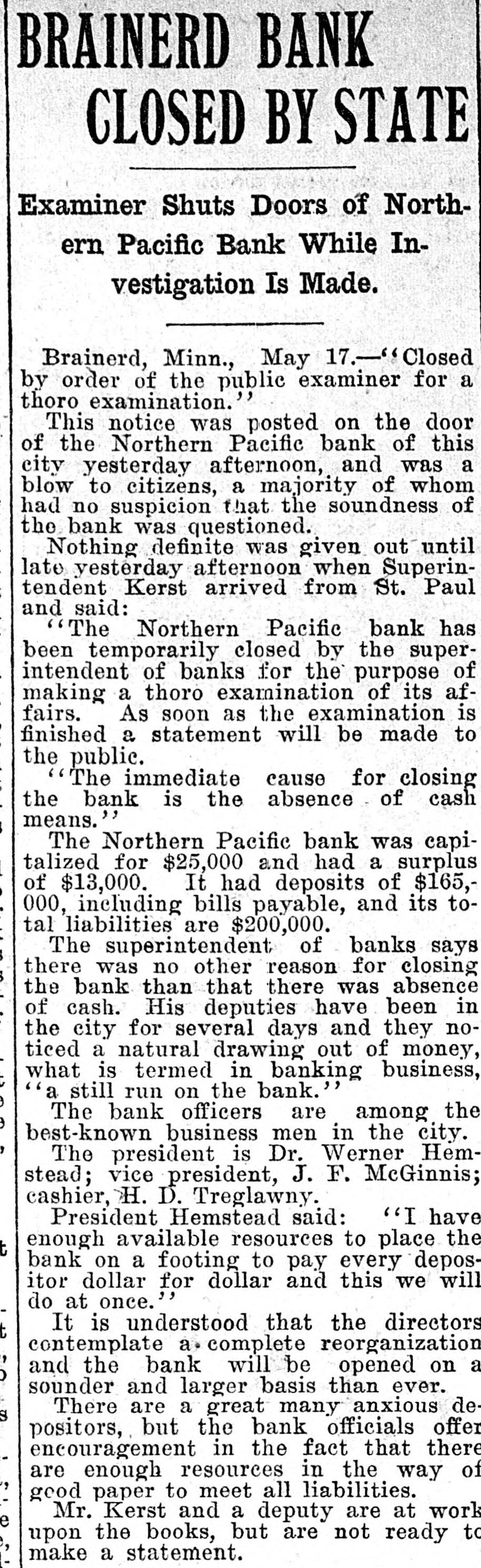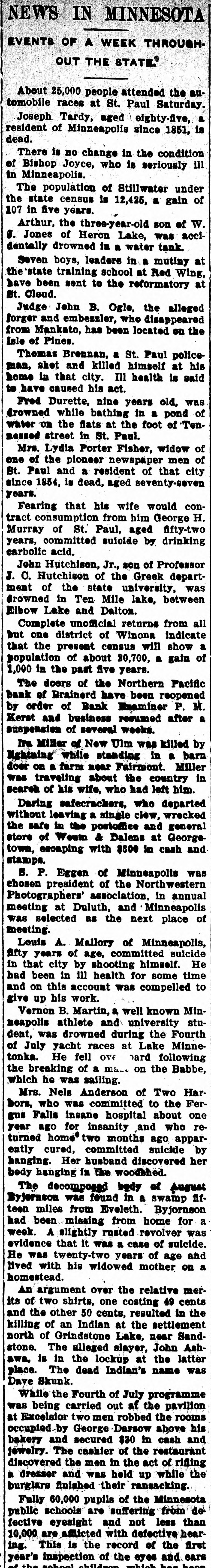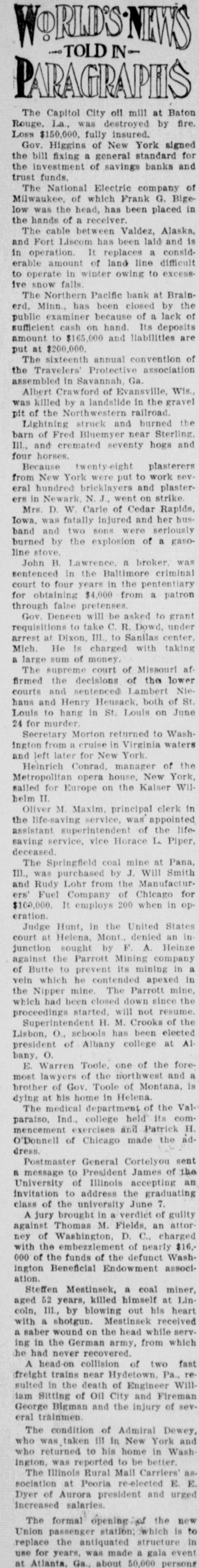 WORLD'S.NEWS TOLDINPARAGRAPIS The Capitol City oil mill at Baton Rouge, La, was destroyed by fire. Loss $150,000, fully insured. Gov. Higgins of New York signed the bill fixing a general standard for the investment of savings banks and trust funds. The National Electric company of Milwaukee, of which Frank G. Bigelow was the head, has been placed in the hands of a receiver. The cable between Valdez, Alaska, and Fort Liscom has been laid and is in operation. It replaces a considerable amount of land line difficult to operate in winter owing to excess. ive snow falls. The Northern Pacific bank at Brainerd. Minn., has been closed by the public examiner because of a lack of sufficient cash on hand. Its deposits amount to $165,000 and liabilities are put at $200,000. The sixteenth annual convention of the Travelers' Protective association assembled in Savannah, Ga. Albert Crawford of Evansville, Wis., was killed by a landslide in the gravel pit of the Northwestern railroad. Lightning struck and burned the barn of Fred Bluemyer near Sterling III., and cremated seventy hogs and four horses. Because twenty-eight plasterers from New York were put to work several hundred bricklayers and plasterers in Newark, N. J., went on strike. Mrs. D. W. Carle of Cedar Rapids, Iowa, was fatally injured and her husband and two sons were seriously burned by the explosion of a gasoline stove. John B. Lawrence. a broker. was sentenced in the Baltimore criminal court to four years in the pententiary for obtaining $4,000 from a patron through false pretenses. Gov. Deneen will be asked to grant requisitions to take C. R. Dowd, under arrest at Dixon, III., to Sanilas center. Mich. He is charged with taking a large sum of money. The supreme court of Missouri af. firmed the decisions of the lower courts and sentenced Lambert Niehaus and Henry Heusack. both of St. Louis to hang in St. Louis on June 24 for murder. Secretary Morton returned to Washington from a cruise in Virginia waters and left later for New York. Heinrich Conrad. manager of the Metropolitan opera house, New York, sailed for Europe on the Kaiser Wilhelm II. Oliver M. Maxim. principal clerk in the life-saving service, was appointed assistant superintendent of the lifesaving service, vice Horace L. Piper, deceased. The Springfield coal mine at Pana, III., was purchased by J. Will Smith and Rudy Lohr from the Manufacturers' Fuel Company of Chicago for $100,000. It employs 200 when in operation. Judge Hunt, in the United States court at Helena, Mont., denied an in junction sought by F. A. Heinze against the Parrott Mining company of Butte to prevent its mining in a vein which he contended apexed in the Nipper mine. The Parrott mine, which had been closed down since the proceedings started. will not resume. Superintendent H. M. Crooks of the Lisbon, O., schools has been elected president of Albany college at A1bany, O. E. Warren Toole, one of the foremost lawyers of the northwest and a brother of Gov. Toole of Montana, is dying at his home in Helena. The medical department of the Valparaiso, Ind., college held its commencement exercises and Patrick H. O'Donnell of Chicago made the address. Postmaster General Cortelyou sent a message to President James of the University of Illinois accepting an invitation to address the graduating class of the university June 7. A jury brought in a verdict of guilty against Thomas M. Fields, an attorney of Washington, D. C., charged with the embezzlement of nearly $16,000 of the funds of the defunct Washington Beneficial Endowment association. Steffen Mestinsek, a coal miner, aged 52 years, killed himself at Lincoln, III, by blowing out his heart with a shotgun. Mestinsek received a saber wound on the head while serving in the German army, from which he had never recovered. A head-on collision of two fast freight trains near Hydetown, Pa., resulted in the death of Engineer William Sitting of Oil City and Fireman George Bigman and the injury of several trainmen. The condition of Admiral Dewey, who was taken 111 in New York and who returned to his home in Wash ington, was reported to be better. The Illinois Rural Mail Carriers' as. sociation at Peoria re-elected E. E. Dyer of Aurora president and urged increased salaries. The formal opening the new Union passenger station: which is to replace the antiquated structure in use for years, was made a gala event at Atlanta. Ga. about 50,000 person#