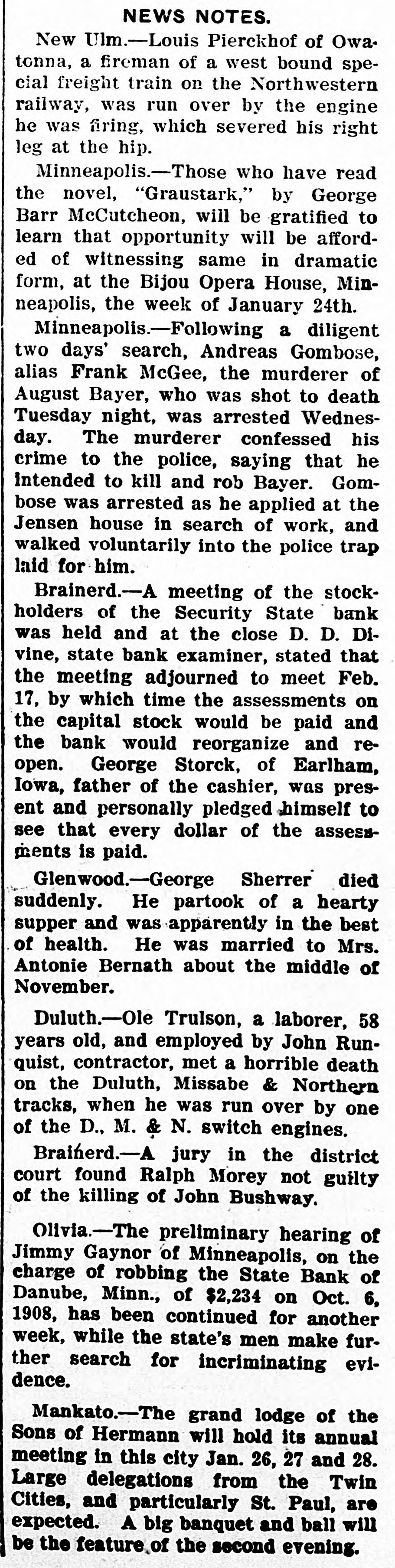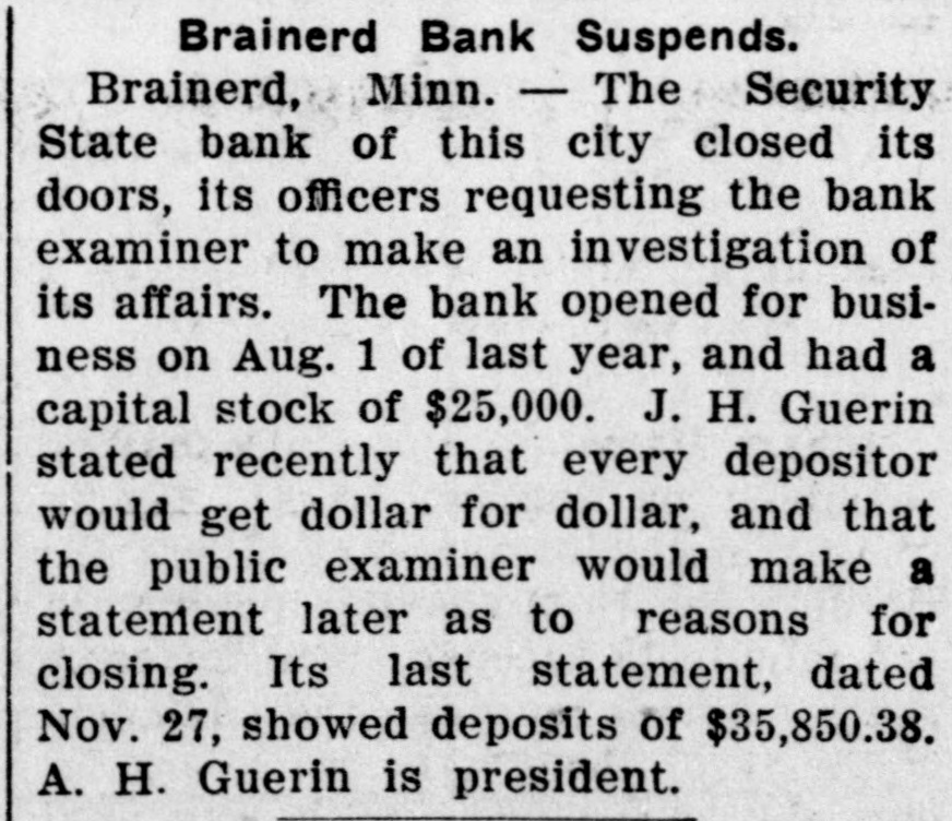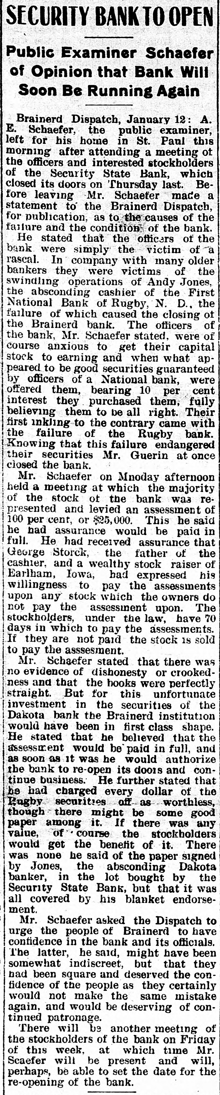 SECURITY BANK TO OPEN Public Examiner Schaefer of Opinion that Bank Will Soon Be Running Again Brainerd Dispatch, January 12: A. E. Schaefer, the public examiner, left for his home in St. Paul this morning after attending a meeting ot the officers and interested stockholders of the Security State Bank, which closed its doors on Thursday last. Before leaving Mr. Schaeter made a statement to the Brainerd Dispatch, for publication, as to the causes of the failure and the condition of the bank. He stated that the officers of the bank were simply the victim of a rascal. In company with many older bankers they were victims of the swindling operations of Andy Jones, the absconding cashier of the First National Bank of Rugby, N. D., the failure of which caused the closing of the Brainerd bank. The officers of the bank, Mr. Schaefer stated, were of course anxious to get their capital stock to earning and when what appeared to be good securities guaranteed by officers of a National bank, were offered them, bearing 10 per cent interest they purchased them, fully believing them to be all right. Their first inkling to the contrary came with the failure of the Rugby bank. Knowing that this failure endangered their securities Mr. Guerin at once closed the bank. Mr. Schaefer on Mnoday afternoon held a meeting at which the majority of the stock of the bank was represented and levied an assessment of 100 per cent, or $25,000. This he said he had assurance would be paid in full. He had received assurance that George Storck, the father of the cashier, and a wealthy stock raiser of Earlham, Iowa, had expressed his willingness to pay the assessments upon any stock which the owners do not pay the assessment upon. The stockholders, under the law, have 70 days in which to pay the assessments. If they are not paid the stock 1S sold to pay the asssesment. Mr. Schaefer stated that there was no evidence of dishonesty or crookedness and that the books were perfectly straight. But for this unfortunate investment in the securities of the Dakota bank the Brainerd institution would have been in first class shape. He stated that he believed that the assessment would bei paid in full, and as soon as it was he would authorize the bank to re-open its doors and continue business. He further stated that be had charged every dollar of the Engby securities off as worthless, though there might be some good paper among it. If there was any value, of course the stockholders would get the benefit of it. There was none he said of the paper signed by Jones, the absconding Dakota banker, in the lot bought by the Security State Bank, but that it was all covered by his blanket endorsement. Mr. Schaefer asked the Dispatch to urge the people of Brainerd to have confidence in the bank and its officials. The latter, he said, might have been somewhat indiscreet, but that they had been square and deserved the confidence of the people as they certainly would not make the same mistake again, and would be deserving of continued patronage. There will be another meeting of the stockholders of the bank on Friday of this week. at which time Mr. Scaefer will be present and will, perhaps, be able to set the date for the re-opening of the bank.
