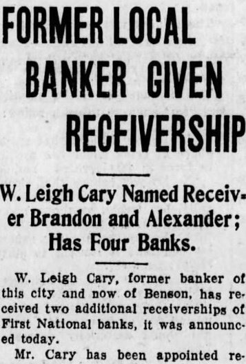 FORMER LOCAL BANKER GIVEN RECEIVERSHIP W. Leigh Cary Named Receiv= er Brandon and Alexander; Has Four Banks. W. Leigh Cary, former banker of this city and now of Benson, has received two additional receiverships of First National banks, it was announced today. Mr. Cary has been appointed re-