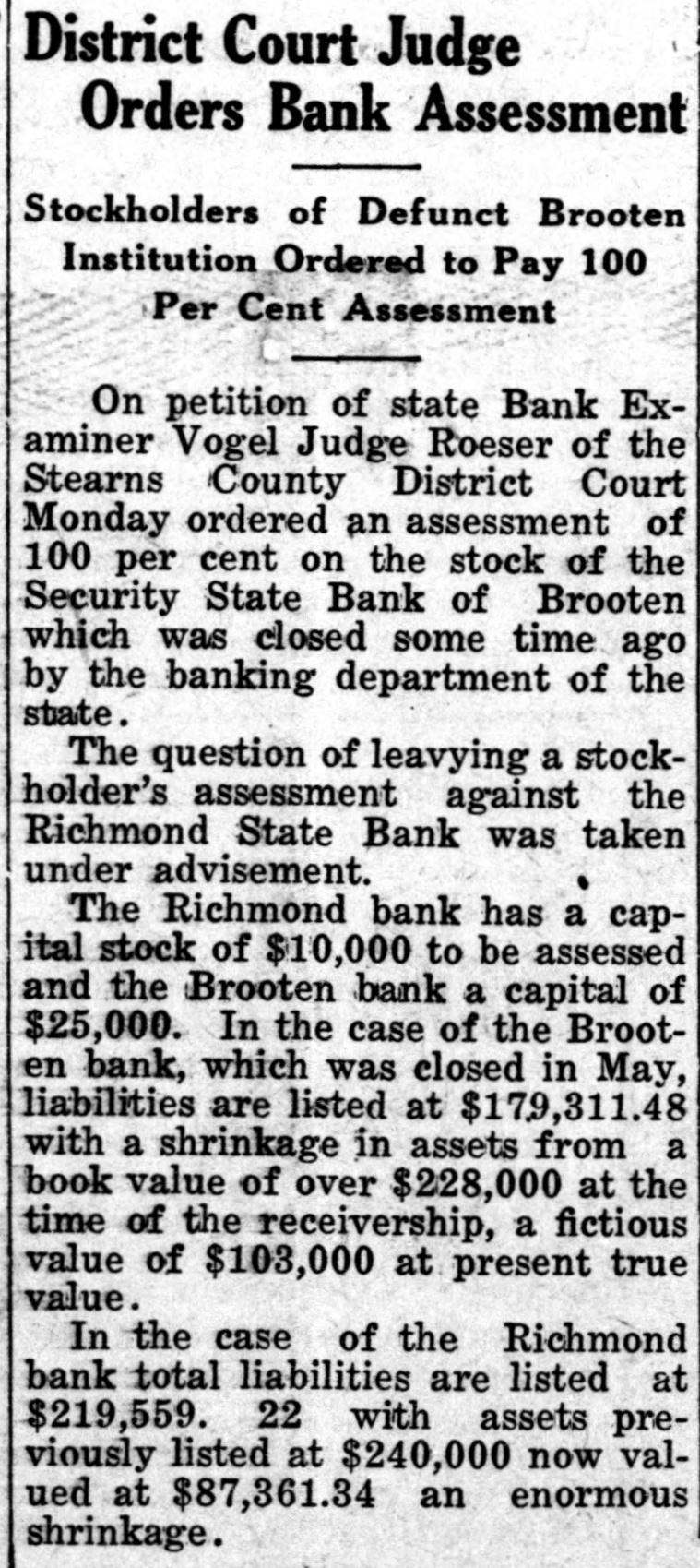 Brooten Bank Probe Starts Anoka County Attorney to Serve as Special Investigator-Depositors Ask Probe Will A. Blanchard, Anoka county attorney, acting as a special representative of the state banking department has started an investigation of the affairs of the Security state bank of Brooten which was disclosed in May. The investigation was ordered on the petition of the depositor committee which approached A. J. Viegel, state superintendent of banking, and asked that the affairs of the bank be thoroughly gone into. No charges have been made, but the committee stated that persistent rumors of mismanagement of the bank funds had resulted in considerable ill-feeling in Brooten and the investigation was desired to either find the cause for the rumors or finally silence them. The state department agreed to the investigation and appointed County Attorney Blanchard to the work. He has worked with the state in the Wright county investigations of last spring which resulted in the conviction of H. M. Sievers on bank looting charges in the Benson bank case concluded yesterday. The officers of the closed Brooten bank were J. P. Wahl, president, a resident of Brooten and C. 0. Knutson, now serving as receiver of the Farmers State Bank of Villard.