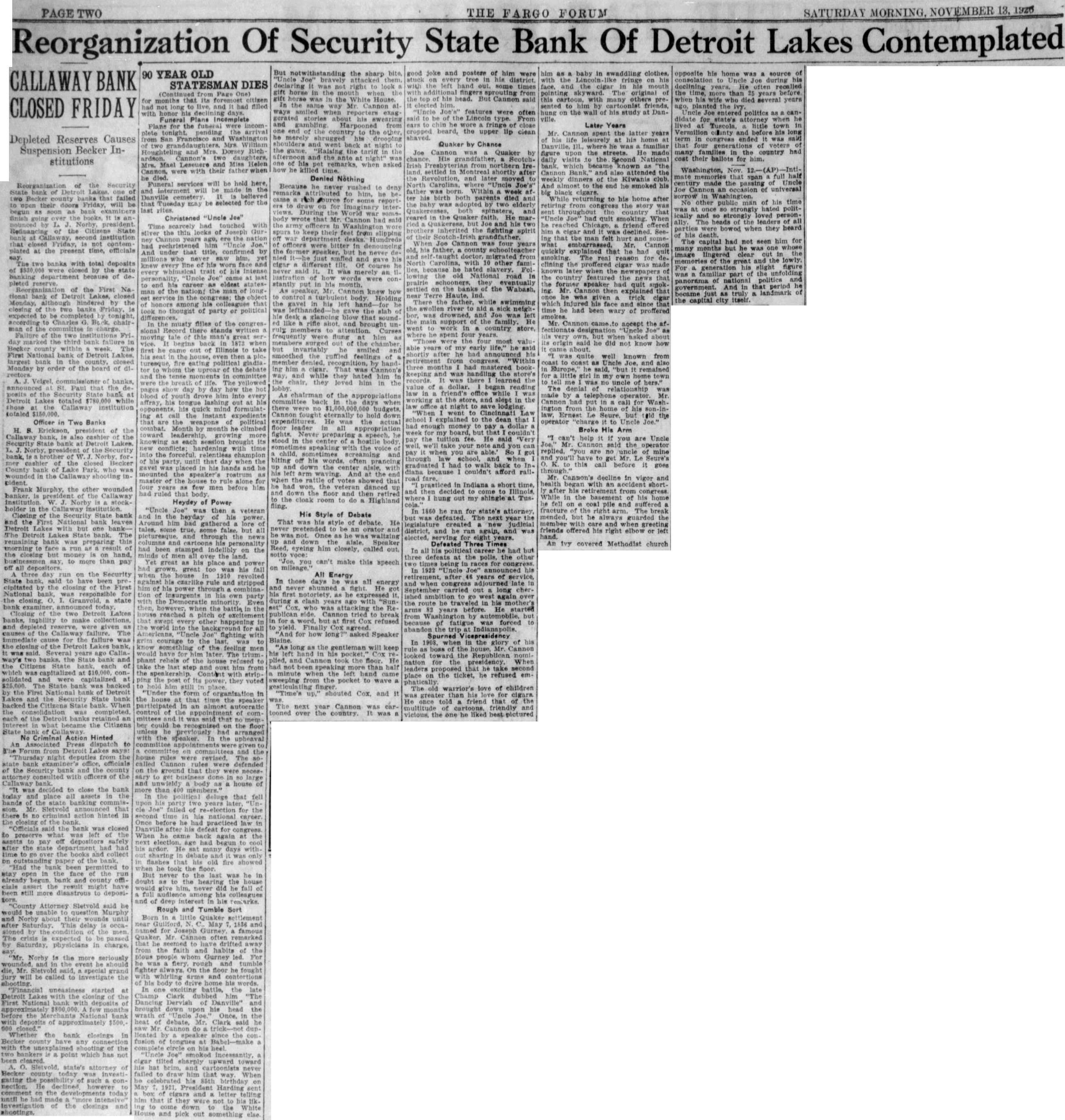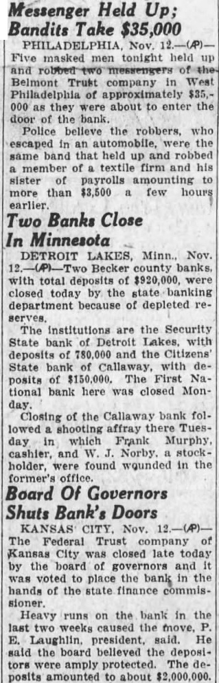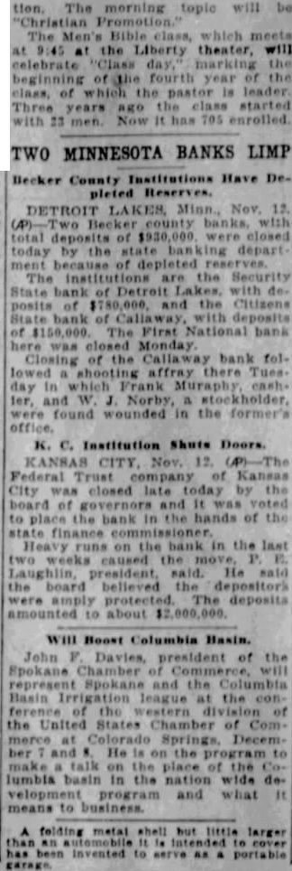 Depleted Reserves Causes Suspension Becker Institutions of Security State bank of two Becker that failed to open their Friday, will be begun as soon as bank finish the of the Citizens State bank at institution that Friday, contem plated at the present time, officials say. two banks with total deposits were closed by the state banking department because of pleted reserve. of the First tional bank of Lakes, Monday, hindered by the of the two banks Friday, expected to be completed by tonight, according to Charles G. chairman the Failure the institutions Fri. day marked the third bank failure in Becker county within The First National bank of Detroit largest the Monday by order of the board of of banks, St. Paul that the posits of the Security State bank at Detroit Lakes totaled $780,000 while the Callaway totaled Officer in Two Banks H. S. Erickson, president of the Callaway cashier the Security State bank at Detroit Lakes is brother Norby former cashier of the closed Becker County bank of Lake Park. who was wounded in the Callaway inFrank Murphy, the other wounded banker. the Callaway W. Norby stockholder in the institution Closing the Security State bank and the National bank Lakes but one Detroit State bank. The remaining bank was preparing this morning to run result the closing but money on hand, businessmen to more than pay off all three on the Security State have been cipitated by the closing of the First National bank, was responsible for the closing. O. state today two Lakes given causes of the The cause for the was the closing the Detroit Lakes years way's two State bank and each which at solidated and capitalized The State bank was backed the First Detroit Lakes the State bank backed State bank. When was of an became the Citizens of No Criminal Action Hinted An Press dispatch from Detroit Lakes night office, officials Security bank the county of the Callaway decided to close the bank today place assets in hands the state Mr. Sletvold that there no action hinted in of the "Officials said bank was closed to preserve of after the state department had and the bank been to bank county cials the result more disastrous deposi"County Attorney Sletvold said would be unable question Murphy and about delay the The crisis expected to passed by Saturday, physicians in Norby is seriously event should die, Mr. Sletvold special be called to the "Financial uneasiness started Lakes the First National deposits few before the National bank deposits of approximately $500. the bank in Becker with the shooting of the two bankers point which has not been state's attorney of Becker today investigating the of such He declined however comment he on the developments today until "more of the closings and