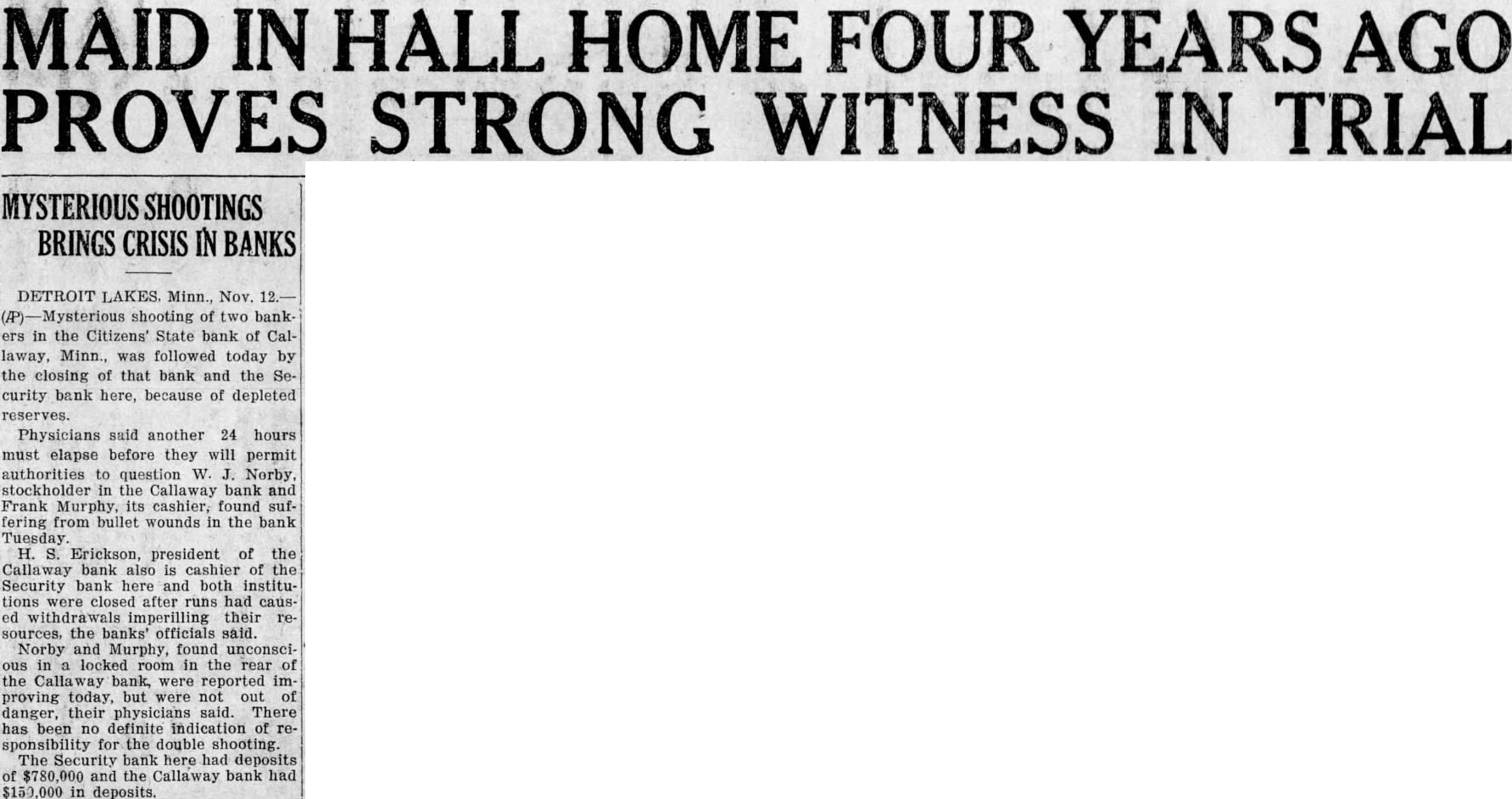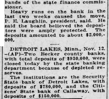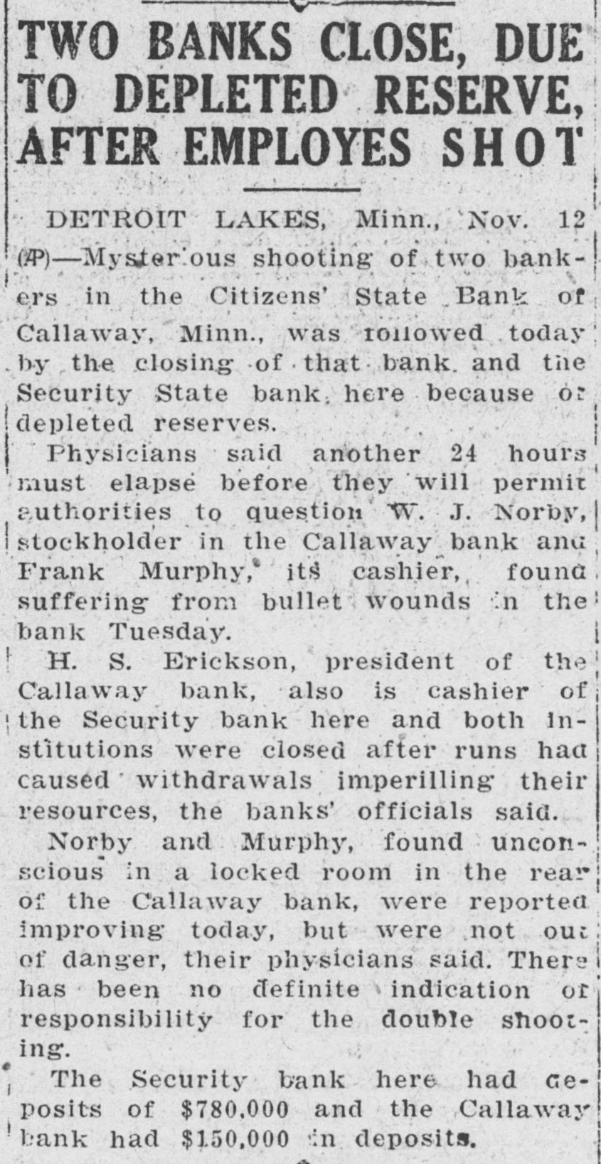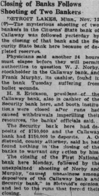 TWO BECKER COUNTY BANKS ARE CLOSED State Banks at Callaway and Detroit Lakes Fail to Open Their Doors Today Detroit Lakes, Minn., Nov. 12.(AP)-Two Becker county banks with total deposits of $930,000 were closed today by the state banking department because of depleted reserves. The institutions are the Security State Bank of Detroit Lakes, with deposits of $780,000. and the Citizens' State Bank of Callaway, with deposits of $150,000. The First National bank here was closed Monday. H. H. Erickson, president of the Callaway bank. is also cashier of the Security bank Closing of the Callaway bank followed the shooting affray there Tuesday in which Frank Murphy, cashier, and W. J. Norby, a stockholder, were found wounded in the former's office. The cause of the shooting and who is responsible for it has not been determined. Declines to Comment County Attorney A. O. Sletvold declined to comment on the developments today before he had a more intensive investigation of the closings and shootings. Financial uneasiness started here with the closing of the First National bank with deposits of approximately $800,000. A few months before the Merchants National bank with deposits of $500,000 closed its doors. Today the Security State bank of this place failed to open its doors. L. J. Norby. president of the bank. is a brother of W. J. Norby, the man who is suffering with wounds in a hospital here. Shortly after the Security State bank closed today, word was received here that the Citizens' State bank at Callaway had closed its doors. Whether the bank closings have any connection with the unexplained shooting of the two Becker county bankers is a point which has not been cleared. Investigation Under Way County Attorney Sletvold was investigating the possibility of there being a connection, but he declined to make any comment on the situation, other than he "was investigating." Thursday night deputies from the state bank examiners' office, officials of the Security bank and the county attorney consulted with officers of the Callaway bank. It was decided to close the bank today and place all assets in the hands of the state banking commission. Mr. Sletvold announced that there is no criminal action hinted in the closing of the bank. Officials said the bank was closed to preserve what was left of the assets to pay off depositors safely after the state department has had time to go over the books and collect on outstanding papers of the bank. Had the bank been permitted to stay open in the face of the run already begun, bank and county of ficials assert the result might have been still more disastrous to depositors. Closing of the Security bank, it is said. has temporarily halted plans for reorganization of the First National. The remaining bank in Detroit Lakes, the Detroit State bank, was preparing this morning to face a run, but money is on hand, business men say, to more than pay off all depositors. County Attorney Sletvold said he would be unable to question Murphy and Norby about their wounds until after Saturday. This delay is occasioned by the cond: tion of the men. Mr. Norby is the more seriously wounded. and in the event he should die, Mr. Sletvold said, a special grand jury will be called to investigate the shooting.