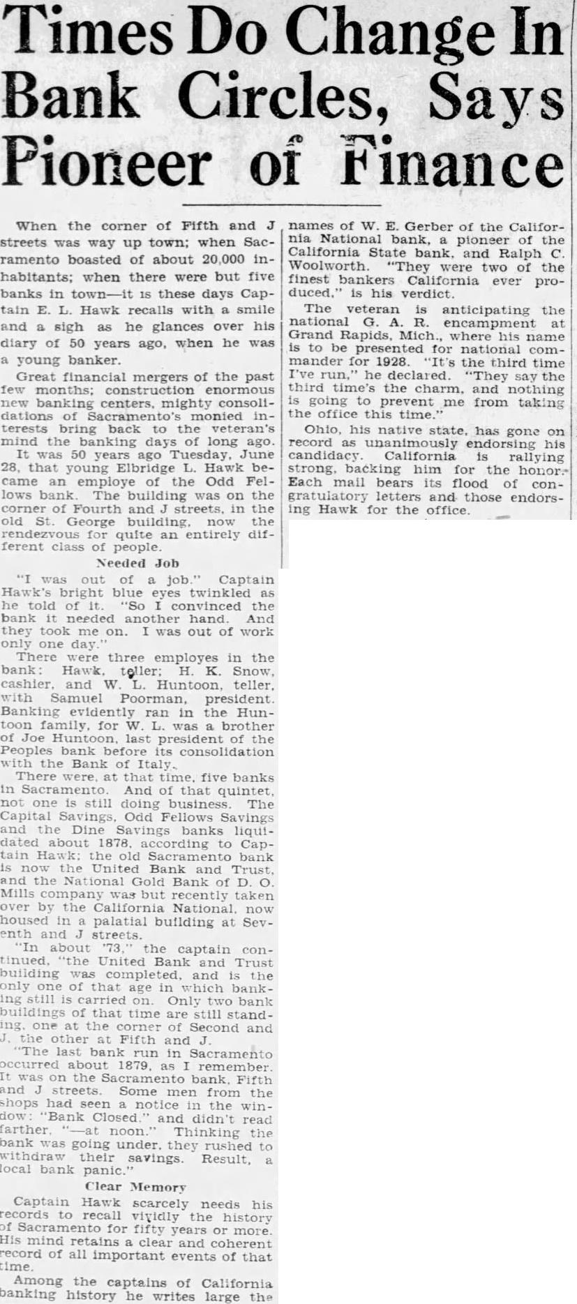 Times Do Change In Bank Circles, Says Pioneer of Finance When the corner of Fifth and streets was way up town; when Sacramento boasted of about 20,000 inhabitants: when there were but five banks in IS these days Captain E. Hawk recalls with smile and sigh as he glances over his diary of 50 years ago, when he was young banker. Great financial mergers of the past few months; construction enormous banking centers, mighty consolidations of Sacramento's monied interests bring back to the veteran's mind the banking days of long ago. It was 50 years ago Tuesday, June 28, that young Elbridge L. Hawk became an employe of the Odd Fellows bank The building was on the corner of Fourth and streets. in the old St. George building. the quite an entirely different class of people Needed Job was of Captain Hawk's bright blue eyes twinkled told convinced the bank needed hand. And they took me on. was out of work only one day There were three employes in the bank Hawk teller: K. Snow, cashier. and W Huntoon, teller. with Samuel Poorman, president Banking evidently ran in the Huntoon for W. brother of Joe Huntoon. last president of the Peoples bank before its consolidation with the Bank of Italy There were. at that time. five banks in Sacramento And of that quintet, one still doing business The Capital Savings, Odd Fellows Savings and the Dine banks liquidated according to Captain Hawk: the old bank now the United Bank and Trust and the National Gold Bank of Mills company was but recently taken over by the California National now housed in palatial building at Seventh and streets about the captain continued. "the United Bank and Trust building was completed. and the only of that age in which bankOnly two bank of that time are still standthe corner Second and the other Fifth and "The bank run in Sacramento occurred about 1879, remember on the Sacramento bank, Fifth and streets Some men from the shops had seen notice in the win"Bank Closed and didn't read farther noon. Thinking the bank was going under. they rushed to withdraw their savings. Result, local bank panic. Clear Memory Captain Hawk scarcely needs his records to recall vividly the history of Sacramento for fifty years or more His mind retains clear and coherent record of all important events of that time Among the captains of California banking history he writes large names of W. E. Gerber of the California National bank, pioneer of the California State bank. and Ralph Woolworth. "They were two of the finest bankers California ever prohis The veteran the anticipating encampment at Grand Rapids, Mich. where his name to be presented for national commander for 1928 the third time I've run," he declared. "They say the third time's the charm. and nothing going to prevent me from taking the office this time. Ohio, his native state, has gone on record unanimously endorsing his candidacy California rallying strong. backing him for the honor.Each mail bears its flood of congratulatory letters and those endorsing Hawk for the office