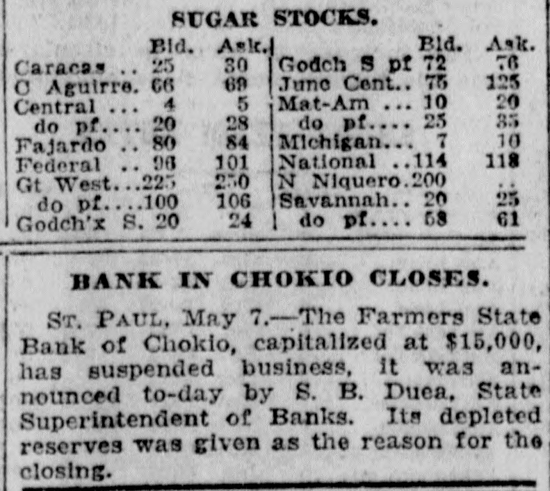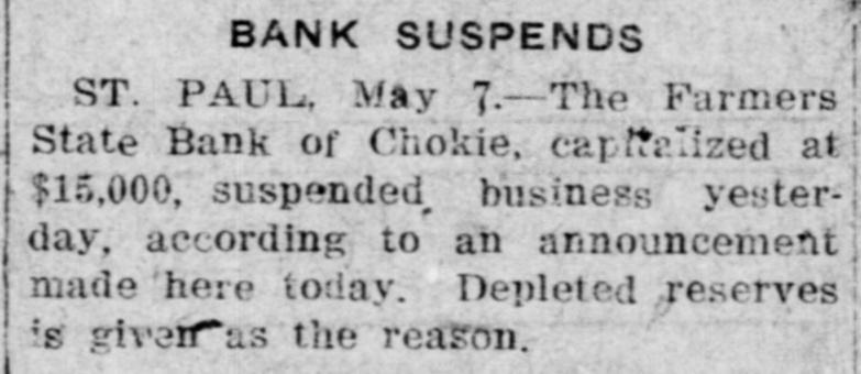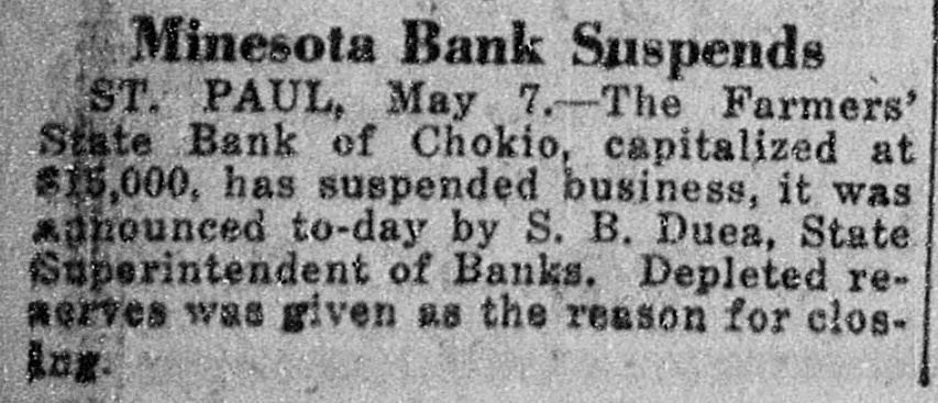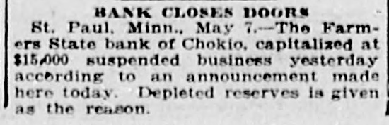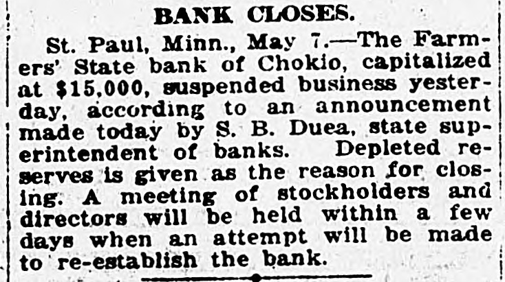 BANK CLOSES. St. Paul, Minn., May 7.-The Farmers' State bank of Chokio, capitalized at $15,000, suspended business yesterday, according to an announcement made today by S. B. Duea, state superintendent of banks. Depleted reserves is given as the reason for closing. A meeting of stockholders and directors will be held within a few days when an attempt will be made to re-establish the bank.