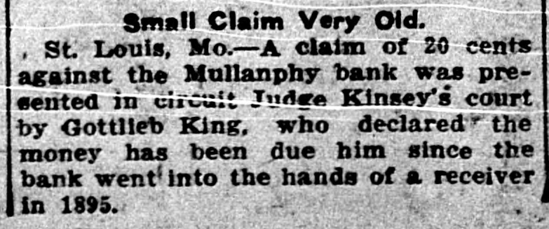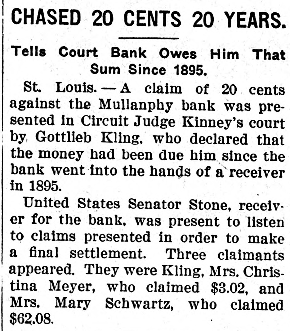 WAITS 20 YEARS FOR 20 CENTS Then Has to Bring Suit to Recover From Bankrupt Bank. A claim of 20 cents against the Mullanphy bank of St. Louis was presented in Circuit Judge Kinsey's court by Gottlieb Kling, who declared that the money has been due him since the bank went into the hands of a receiver in 1895. United States Senator W. J. Stone, receiver for the bank, was present to listen to claims presented in order to make a final settlement. Three claimants appeared. They were Kling, Mrs. Christina Meyer, who claimed $3.02. and Mrs. Mary Sebwartz, who claimed $62.08