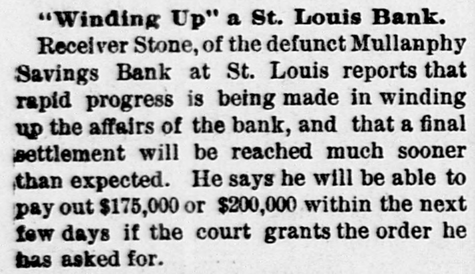 MULLANPHY BANK FAILS. St. Louis Savings Bank Closes With $800,000 Liabilities. St. Louis, Feb. 27.-State Bank Examiner C. O. Austin today closed the Mullanphy Savings bank, a state institution which has been in operation here for more than twenty-five years. He is unable yet to give out any figures which would show the condition of the bank, but hopes to have the books in such shape as to be able to make a report early next-week. The following statement, issued at the close of business on February 26, 1897, by the bank is as follows: Liabilities: Capital stock, $100,000; surplus, $5,204; demand deposits, $248,132; time deposits, $396,088; certificates of deposit, sight,$8,208; cashier's checks, $3,434; bills payable, $45,000; total, $806,069. Resources: Bills receivable, $561,753; bonds, $54,061; real estate, $89,112; cash in vault, $42,946; cash in banks, $58,197; total, $806,069. Yesterday the Continental National bank, through which the Mullanphy bank cleared, notified the chairman of the Clearing House association that it would not clear for the savings institution any longer, because of its condition. Mr. Austin had examined into the bank's condition and, finding it unsafe, had reported SO to the Continental National, and its action followed. Last night the executive committee of the Clearing House association met to devise some means of carrying the bank over, but decided that it could do nothing to help it. This becoming known to some of its depositors, about forty of them assembled at the bank when it opened at 9 o'clock this morning and began a run. Examiner Austin, seeing how matters were going, promptly closed the bank and the depositors were put out of doors. There was much indignation among the depositors, who are mostly poor people. The failure caused somewhat of a sensation throughout the city, as this is the first bank in St. Louis to fail for many years. The bank holds a lot of paper of Schwarz Bros. Commission company. This firm held chattel deeds of trust on 250,000 sacks of wheat in the Farmers' elevator to secure outstanding notes aggregating $25,000 and similar notes on real estate to secure $7,016 worth of their paper. It is not known whether this paper was discounted at the Mullanphy bank. Just before the United States internal revenue department made the change relating to whisky in bond, young T .A. Teuscher, it is said, took quite a flyer in whisky, counting on a rise in price. Mr. Teuscher's efforts to corner the market ran up his overdrafts with the Mullanphy bank to $80,000. President John Rottman said today that it was a dead loss. President Rottman also borrowed freely from the institution to push his whisky business. His stock is up for collateral. There are other whisky dealers who have, it is said, had their paper honored freely by the directors. President John Rottman said to a reporter: "The bank has plenty of money. We did not close because we were broke. The bank examiner had to shut us down because the Continental bank played a snap on us. They would not clear for us, and we had to quit. I guess if we can get somebody to clear for us we can start again all right."