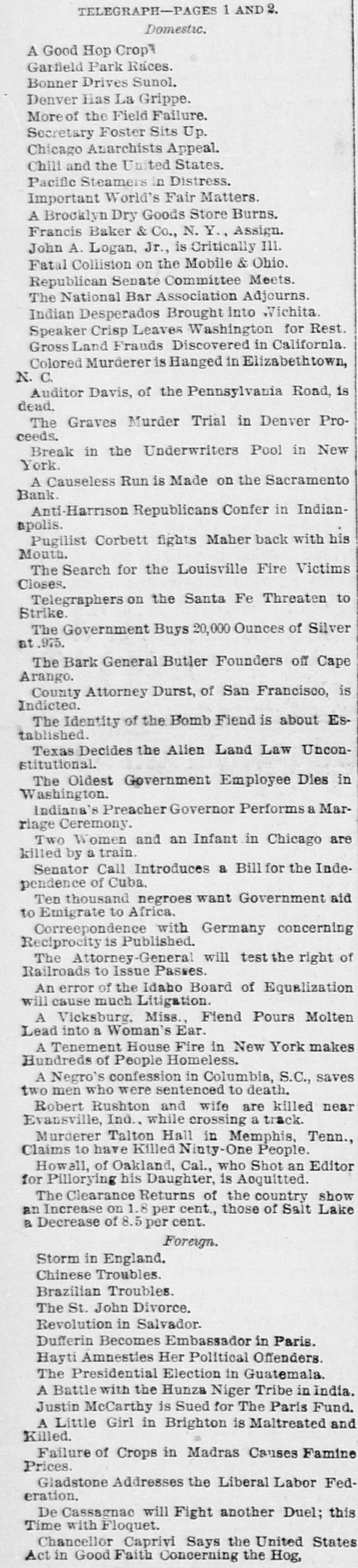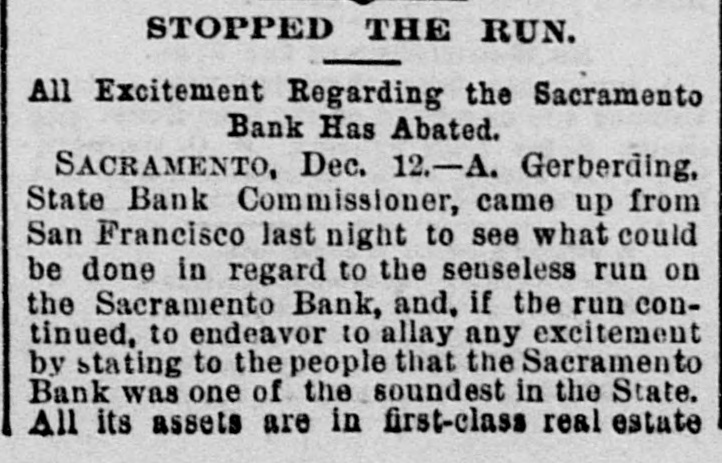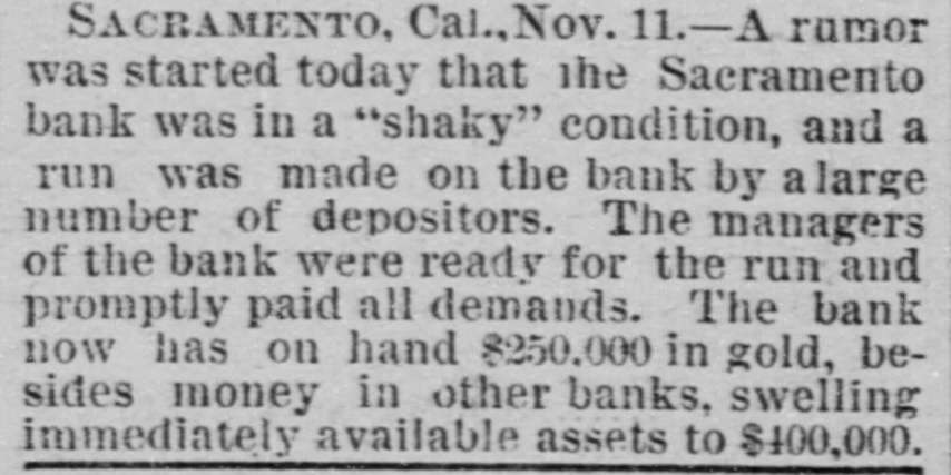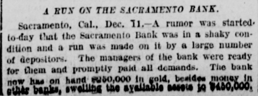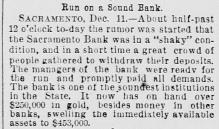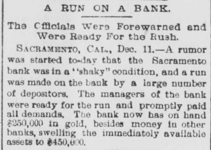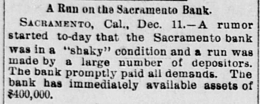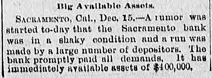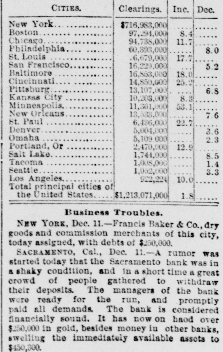 CITIES. Inc. Dec. Clearings. New York $716,983,000 Boston 8.4 97,294,000 Chicago 11.7 94,738,000 Philadelphia 60,393,000 8.0 St. Louis 17.7 -6,679,000 San Francisco 16,229,000 5.2 Baltimore 18.0 16,853,000 Cincinnati 25.2 14,850,000 Pittsburg 13,107,000 6.8 Kansas City 8.3 10,203,000 Minneapolis. 53.1 11,361,000 New Orleans 13,588,000 7.6 St. Paul 22.7 6,436,000 Denver 5,004,000 3.6 Omaha 5,109.000 2.3 Portland, Or 12.9 2,470,000 Salt Lake. 1,744,000 8.5 Tacoma 1,008,000 1.4 Seattle 1,052,000 3.3 Los Angeles. 10.0 922,224 Total principal cities of the United States 1.8 $1,213,071,000 Business Troubles. NEW YORK, Dec. 11.-Francis Baker & Co., dry goods and commission merchants of this city, today assigned, with debts of $250,000. SACRAMENTO, Cal., Dec. 11.-A rumor was started today that the Sacramento bank was in a shaky condition, and in a short time a great crowd of people gathered to withdraw their deposits. The managers of the bank were ready for the run, and promptly paid all demands. The bank is considered financially sound. It has now on haod over $250,000 in gold, besides money in other banks, swelling the immediately available assets to $450,300.