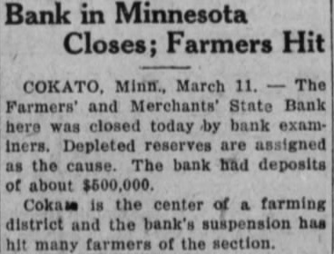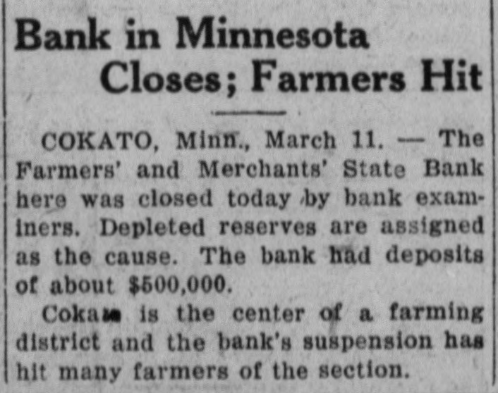Bank in Minnesota Closes; Farmers Hit COKATO, Minn., March 11. - The Farmers' and Merchants' State Bank here was closed today by bank examiners. Depleted reserves are assigned as the cause. The bank had deposits of about $500,000. Cokase is the center of a farming district and the bank's suspension has hit many farmers of the section.