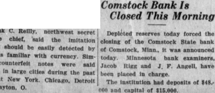 Comstock Bank Is Closed This Morning Depléted reserves today forced the closing of the Comstock State bank of Comstock, Minn., it was announced today. Minnesota bank examiners, Jacob Rigg and J. F. Angell, have been placed in charge. The institution had deposits of $48.000 and capital of $15,000.