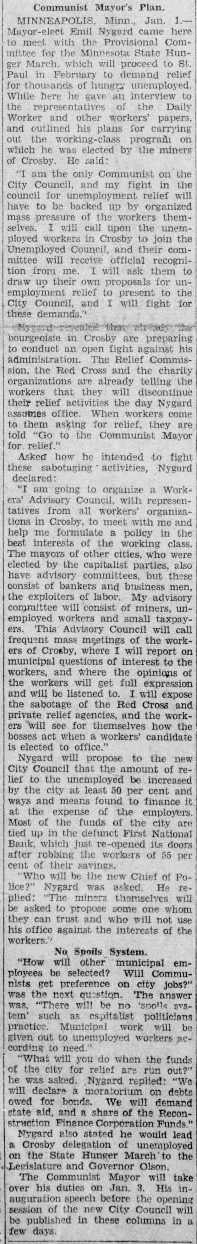 Communist Mayor's Plan. MINNEAPOLIS, Minn., Jan. 1.Mayor-elect Emil Nygard came here to meet with the Provisional Committee for the Minnesota State Hunger March, which will proceed to St. Paul in February to demand relief for thousands of hungry unemployed. While here he gave an interview to the representatives of the Daily Worker and other workers' papers, and outlined his plans for carrying out the working-class program on which he was elected by the miners of Crosby. He said: "I am the only Communist on the City Council, and my fight in the council for unemployment relief will have to be backed up by organized mass pressure of the workers themselves. I will call upon the unemployed workers in Crosby to join the Unemployed Council, and their committee will receive official recognition from me. I will ask them to draw up their own proposals for unemployment relief to present to the City Council, and I will fight for these demands." Nygard revealed that ady the bourgeoisie in Crosby are preparing to conduct an open fight against his administration. The Relief Commission, the Red Cross and the charity organizations are already telling the workers that they will discontinue their relief activities the day Nygard assumes office. When workers come to them asking for relief, they are told "Go to the Communist Mayor for relief." Asked how he intended to fight these sabotaging activities, Nygard declared: "I am going to organize a Workers' Advisory Council, with representatives from all workers' organizations in Crosby, to meet with me and help me formulate a policy in the best interests of the working class. The mayors of other cities, who were elected by the capitalist parties, also have advisory committees, but these consist of bankers and business men, the exploiters of labor. My advisory committee will consist of miners, uriemployed workers and small taxpayers. This Advisory Council will call frequent mass meetings of the workers of Crosby, where I will report on municipal questions of interest to the workers, and where the opinions of the workers will get full expression and will be listened to. I will expose the sabotage of the Red Cross and private relief agencies, and the workers will see for themselves how the bosses act when a workers' candidate is elected to office." Nygard will propose to the new City Council that the amount of relief to the unemployed be increased by the city at least 50 per cent and ways and means found to finance it at the expense of the employers. Most of the funds of the city are tied up in the defunct First National Bank, which just re-opened its doors after robbing the workers of 55 per cent of their savings. "Who will be the new Chief of Police?" Nygard was asked. He replied: "The miners themselves will be asked to propose some one whom they can trust and who will not use his office against the interests of the workers." No Spoils System. "How will other municipal employees be selected? Will Communists get preference on city jobs?" was the next question. The answer was, "There will be no spoils SVStem' such as capitalist politicians practice. Municipal work will be given out to unemployed workers according to need.' "What will you do when the funds of the city for relief are run out?" he was asked. Nygard replied: "We will declare a moratorium on debts owed for bonds. We will demand state aid, and a share of the Reconstruction Finance Corporation Funds." Nygard also stated he would lead a Crosby delegation of unemployed on the State Hunger March to the Legislature and Governor Olson. The Communist Mayor will take over his duties on Jan. 3. His inauguration speech before the opening session of the new City Council will be published in these columns in a few days.