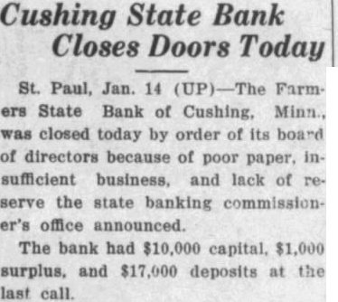 Cushing State Bank Closes Doors Today St. Paul, Jan. 14 Farmers State Bank of Cushing, Minn., closed today by order of its board of directors because of poor paper, sufficient business. and lack of serve the state banking commissionoffice announced. The bank had $10,000 capital, $1,000 surplus, and $17,000 deposits the last call.