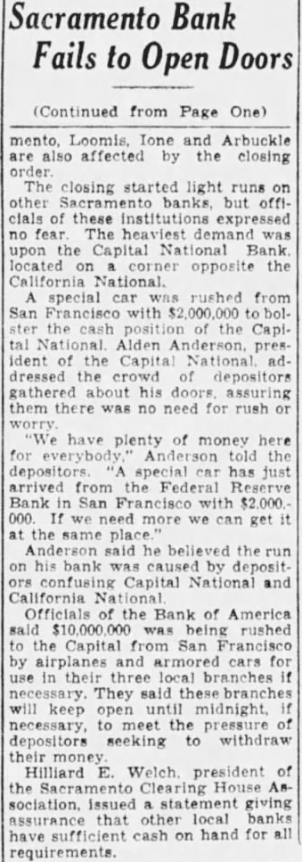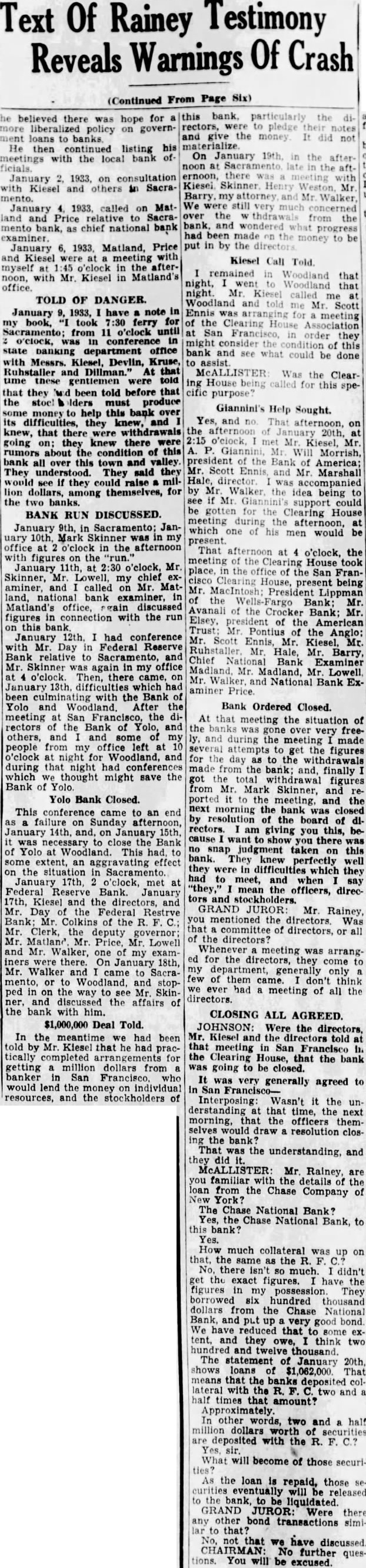 TOLD OF DANGER. January 1933, have note in my book, "I took 7:30 ferry for Sacramento; from 11 o'clock until o'clock, in conference in state department office with Messrs. Klesel, Devlin, Kruse, Ruhstaller and Dillman." At time these gentlemen were told that they Mid been told before that the stocl Iders must produce some money to help this bank over its difficulties, they knew, and that there were withdrawals going on; they knew there were rumors about the condition of this bank all over this town and valley. They understood. They said they would see If they could raise million dollars, among themselves, for the two BANK RUN DISCUSSED. January 9th, in Sacramento; January 10th, Mark Skinner was in my office at o'clock in the afternoon with figures on the run. January 11th at Skinner, Mr. Lowell, my chief examiner, and called Mr. Matland, national bank examiner, in figures in connection with the run on this January had conference with Mr. Day Federal Reserve Bank relative to Sacramento, and Mr. Skinner was again in my office at o'clock. Then, there came, on January 13th. difficulties which had been culminating with the Bank Yolo and Woodland. After the meeting San Francisco, the directors of the Bank of and others, and and some of my people from my office left at o'clock at night for Woodland, and during that night had conferences which We thought might save the Bank of Yolo Bank Closed. This conference came to an end as failure on Sunday afternoon, January 14th, and, on 15th, was to the Bank of Yolo at Woodland. This had, some extent, an aggravating effect on the situation in Sacramento. January 17th, o'clock, met at Federal Reserve Bank. January 17th, Kiesel and the directors, and Mr. Day Federal Restrve Bank Mr. Colkins of the R. Mr. Clerk, the deputy governor; Mr. Matland Mr. Price, Mr. Lowell and Mr. Walker, one of my examiners were there. On January 18th, Mr. Walker and came to Sacramento, or to Woodland, and stopped in the way see Mr. Skinner, and discussed the affairs of the bank with him. $1,000,000 Deal Told. In the we had been told by Mr. Kiesel that he had practically completed rrangements for getting million dollars from banker in San Francisco. who would lend the money on individual resources, and the stockholders of this particularly the directors, were to notes and the money On January noon at Sacramento the aft. ernoon, there Henry my attorney and Mr. We were still very concerned over the thdrawals from the had been made the money to be put in by the directors